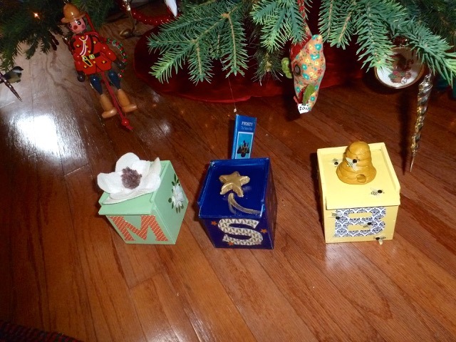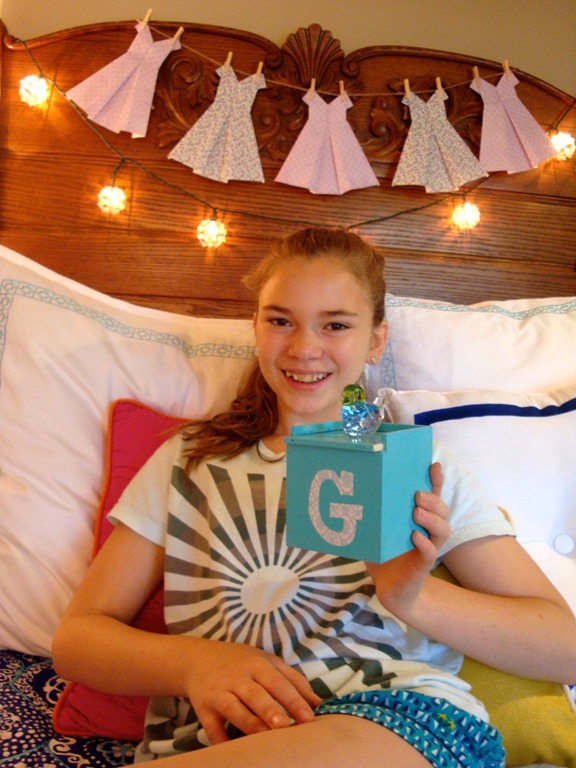 These are the “Hundred Penny Boxes” that I helped Magnolia, Stella, and Byron decorate. They were a Christmas present last year from Mama and Daddy. Everyone in the family got one, undecorated, but containing the number of pennies that correspond with the number of years each box recipient has been alive—with each penny’s date representing one of those years of life. The earliest date that Mama had to find was Mark’s first year of life—1961! We’re now responsible for adding a new penny to the box on each of our birthdays. Mama had the boxes handmade specially! The inspiration for this gift was a Caldecott award winning children’s picture book, The Hundred Penny Box. We each got a copy with our boxes. I decorated my box with beach treasures I found in the Bahamas, and I helped my other niece, Grace, decorate hers in July.