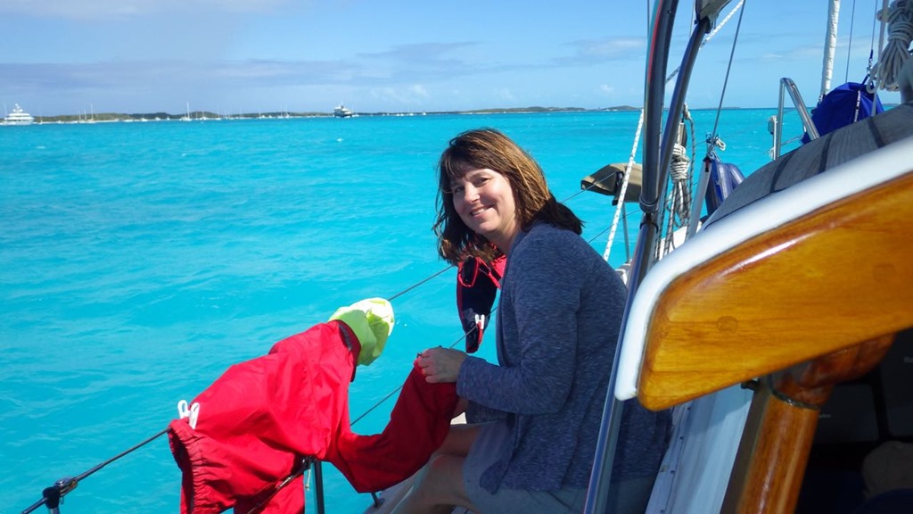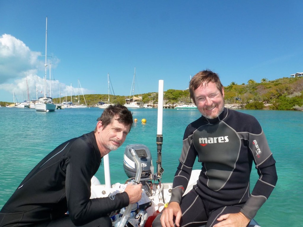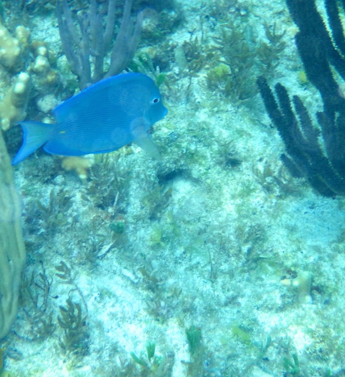 Judy got some good pictures with the underwater camera that she brought.  The last snorkeling spot was pretty murky, plus we were getting chilled so we didn’t stay long.  Since this site was in the middle of the harbor near where Nancy Lu was anchored, Judy and I decided to swim back to the boat escorted by Captain Mark and Alan in the dinghy.  We made it with no problems.  I took the opportunity to check the anchor and found that we were dug in great!  Back on board Nancy Lu, I went below to get Timmy from his cage, where we had left him while we were gone, so he could be on deck with us while we rinsed ourselves and our snorkel gear off, but more importantly so he could do his “business”.  Judy heard a splash and hollered that Timmy fell in the water!  I jumped in to save him; although, he was swimming just fine along the hull of the boat.  The old man would not have lasted long!  This incident called for a change in the immediate agenda.  Timmy got a quick bath before dinner to wash off the sticky salt!  The incident also confirmed the nececcessity of the practice that we had been following—always walking him around the deck with his harness and leash—we haven’t broken procedure since!  We spent the rest of the day relaxing and visiting.  Ann from s/v Krazy Lady, who was part of the group that we went with to the Jumentos islands last year, came by before dinner to visit a little and say good-bye since she was leaving in the morning.  We were so glad to see her, and she entertained Alan and Judy with her fun personality!  The evening activity aboard Nancy Lu was a rematch of the game of Sequence that we had played earlier in the afternoon and a little Rummikub.