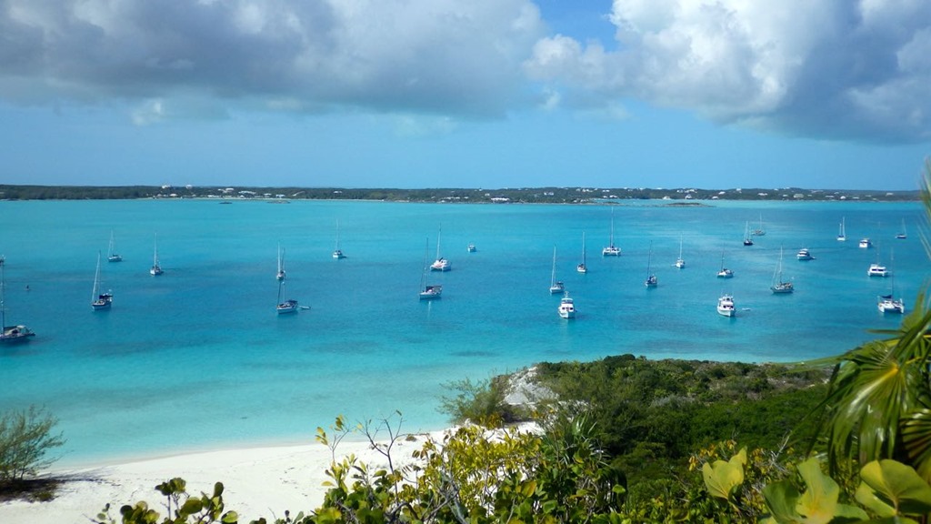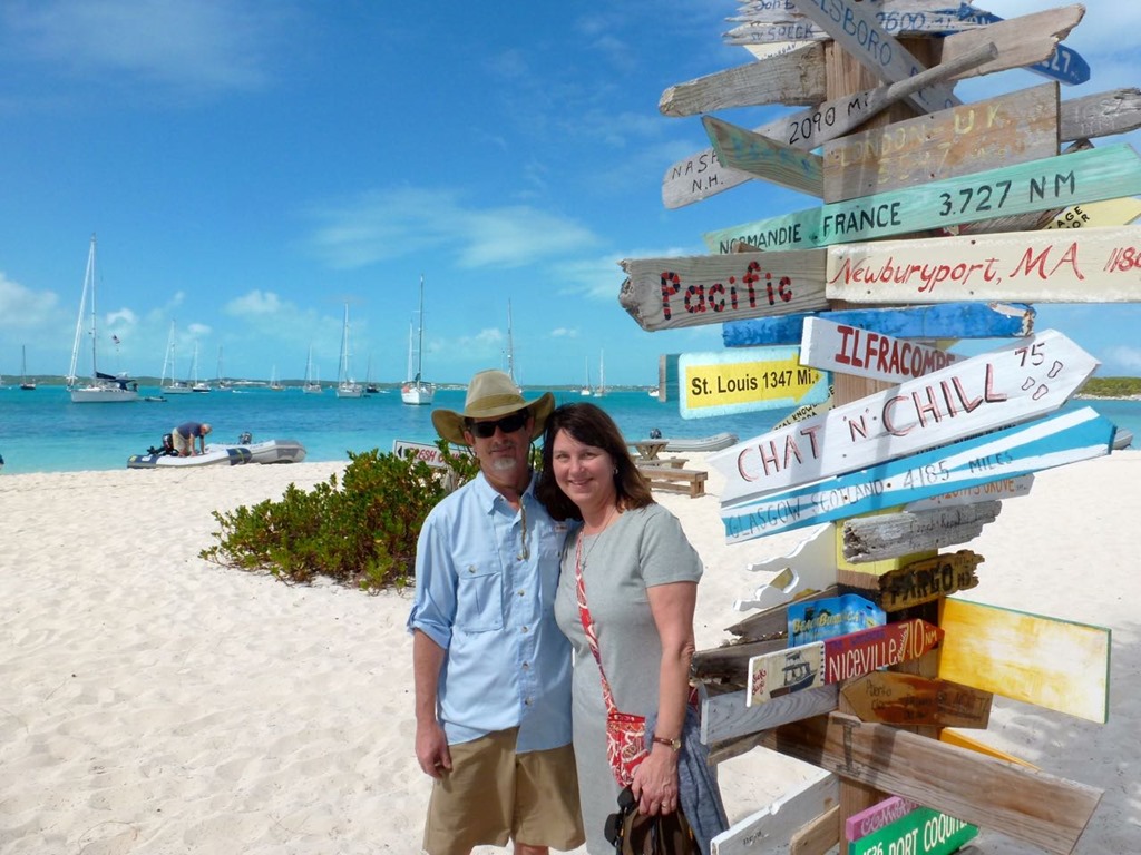 Alan is Captain Mark’s brother and Judy is his wife of 25 years.  As we said our good-byes in January, I joked that we were off to get their cruising vacation all set up.  In a way, that was true.  Their visit with us was in the back of my mind as I provisioned in Brunswick, as we planned routes, and as we  looked forward to the near future in general.  Our plan was to meet them in George Town, the biggest town on Great Exuma Island, on Saturday, February 21.   The Cruiser’s Regatta takes place around that time every year, and there are hundreds of boats in Elizabeth Harbour!  On the evening Judy and Alan arrived, there were 373 boats in the harbor as reported earlier that morning on VHF channel 72 on the 8:00am “net” (a cruiser’s daily informational call-in “program”).  At that time, we were anchored in Kidd’s Cove on the side of Elizabeth harbour closest to George Town.  That night, as we looked across the big harbor towards Stocking Island where most of the sailboats are anchored (and there is no town),  all the anchor lights looked like a city skyline!  It’s quite a sight to see!
