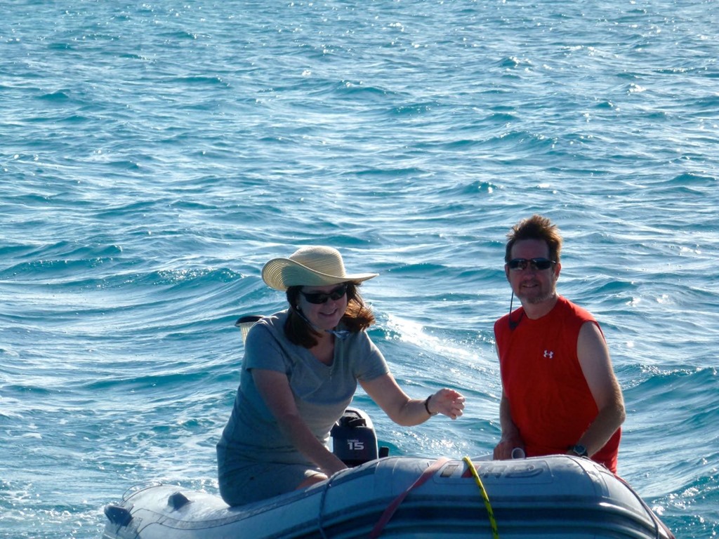 Of course, we want the weather to be good when we have guests.  As Alan and Judy’s arrival date got closer, we were worried about the high winds that were predicted for their arrival date!  A dinghy ride loaded down with luggage, high winds, and the  rough harbor that those winds create is not the best welcome to a weeklong vacation on a sailboat!  We considered using a water taxi to ferry them to Nancy Lu, but in the end, we opted for Captain Mark to pick up our guests in the dinghy.  He brought trash bags to put their luggage in to keep it dry, foul weather gear for them to put on to keep their bodies and clothes dry, and  water proof socks and crocs for their feet .  They were troopers, and everything worked out fine.  Alan did mention something about a bucking bronco!  The next morning, they said they slept better that first night than they had in a while.  I; however, hardly got any sleep from worrying about how they were sleeping up in the V-berth!  I almost convinced myself that I was seasick from the motion, and all the sounds that are usually like white noise to me got on my last nerve!