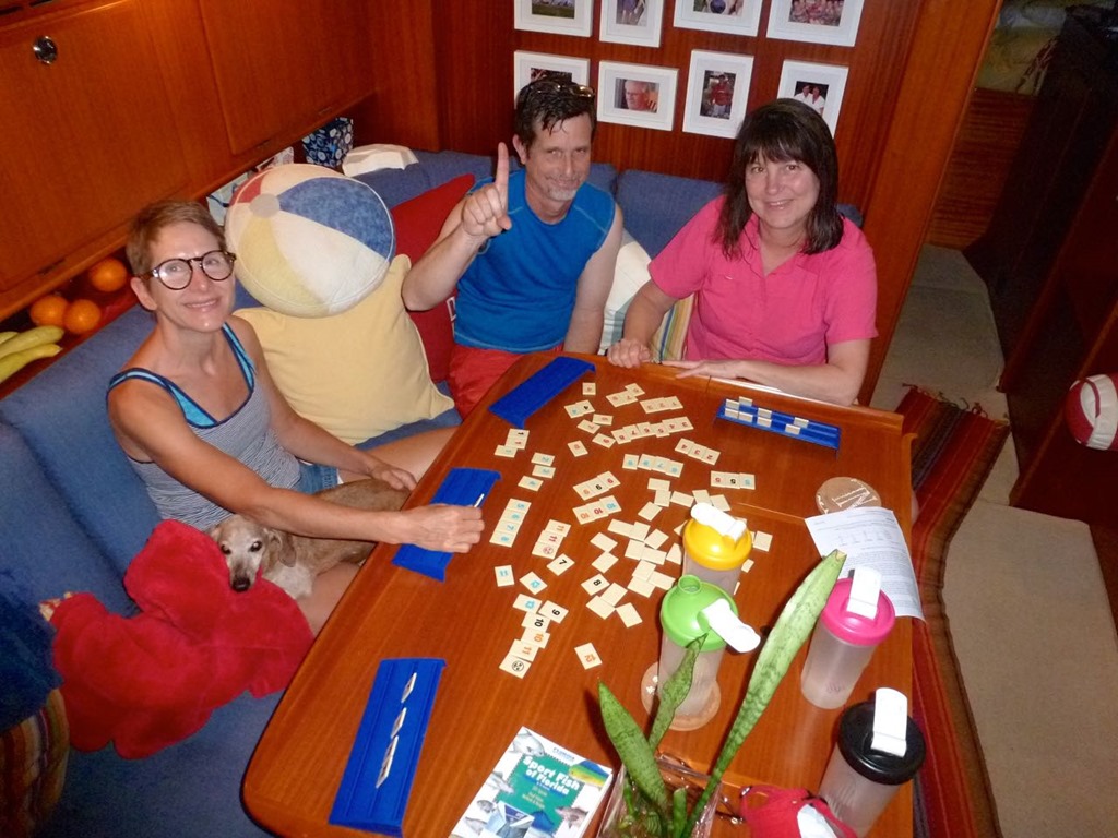 After a pretty calm dinghy ride home (I still wore my foul weather gear—no “dinghy butt” for me!), we capped off the night with another game of Sequence.  Judy and I actually tied the guys that night, but they broke the tie the next night!