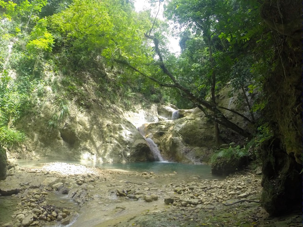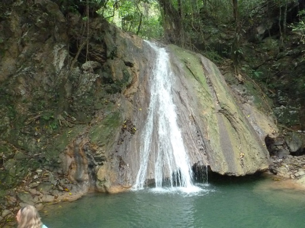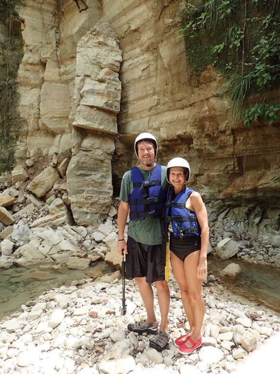 and joining all but 2 of our Chat-n-Chill Rat Pack group for a tour to the Dominican Repuplic-style amusement park, 27 natural waterfall slides (I can’t remember the name of the river). The day included transportation and a WONDERFUL buffet-style, all-you-can-eat meal. I discovered a spice that was used in the rice and beans and meat dishes at our lunch there. It tasted somewhat like cilantro, but it looked different—long leaves. It was delicious! Papo arranged the tour. When he was at our boat, he told us that the actual sliding down the waterfalls was a separate charge of $13.00. So the whole day was $50.00 a person—not bad! Apparently, Papo neglected to tell some of the other boats this bit of information, so that made for some dissatisfied customers at the beginning, but most of them were able to get over it and go ahead and enjoy the day. When we were told that closed toed shoes were required, another bit of information we were not informed of ahead of time,