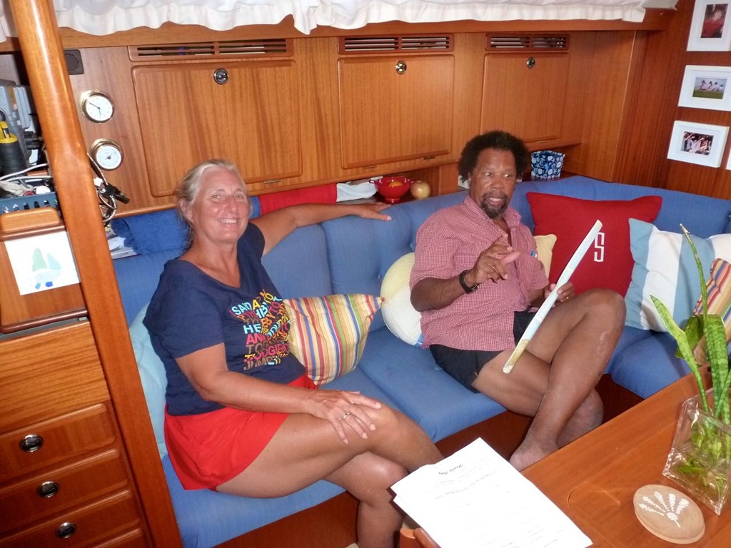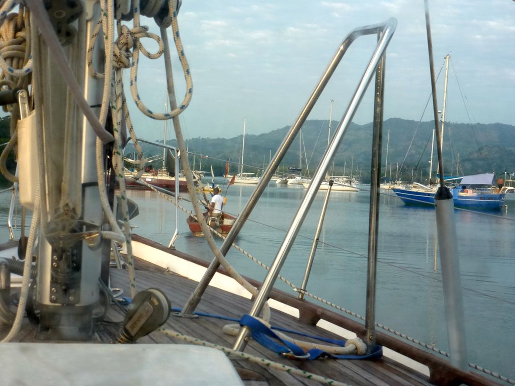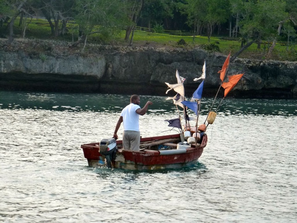 sell the Dominican Republic courtesy flag for $10.00, arrange tours for cruisers, and bring out fuel and ice to the boats among other things. Papo was the one who brought the Commandante’ of the Navy and various other customs officials out to our boat soon after we got moored. Papo speaks a little English and was helpful in our dealings with these men on our boat during that stage of our check-in procedure. There is talk among cruisers of corruption among officials—asking for money that is not required—but we had a very pleasant experience with the guys on our boat. I had made some cookies and coffee to serve them as we were being guided down the channel to the harbor. They passed on the coffee, but seemed to enjoy the cookies. No money was asked for or paid at this point.