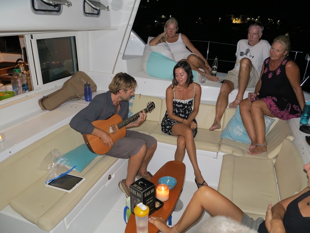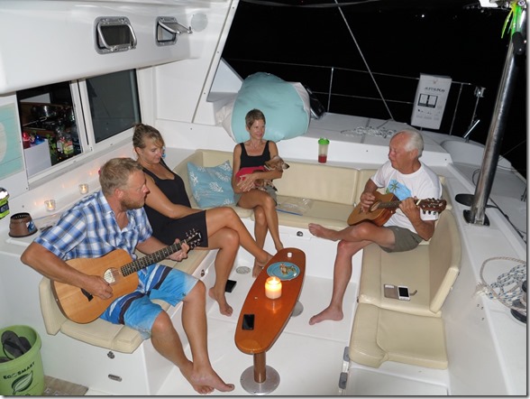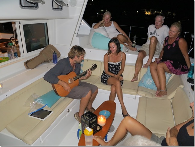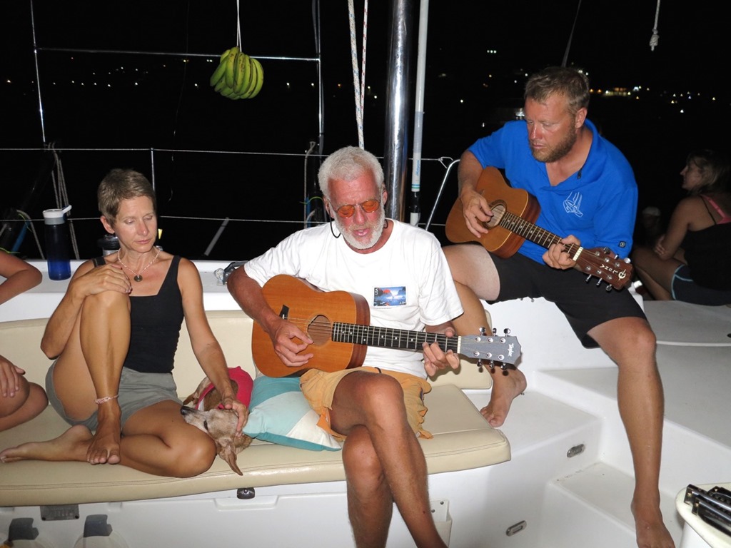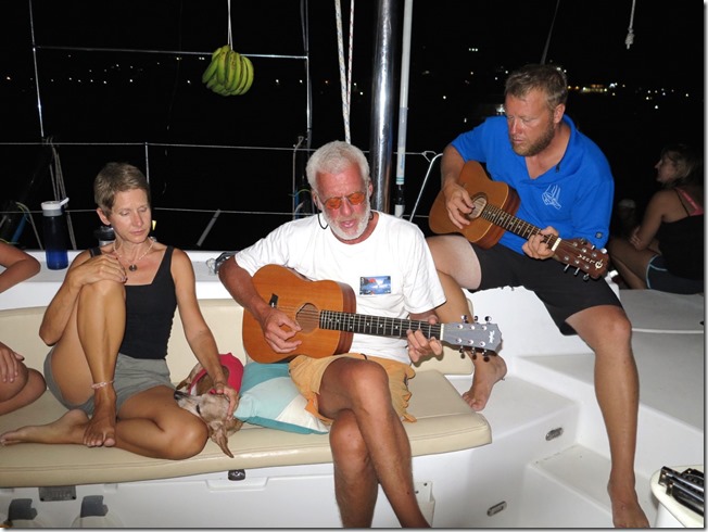 Another night while anchored in the harbor at the town of Dewey on Isla De Culebra, SVI, Cliff, temporary crew on s/v Glass Slipper, is jamming on our “Baby Taylor” with Steve. He had me singing a song he knew I would know the words to, “Amazing Grace”, with him at one point!