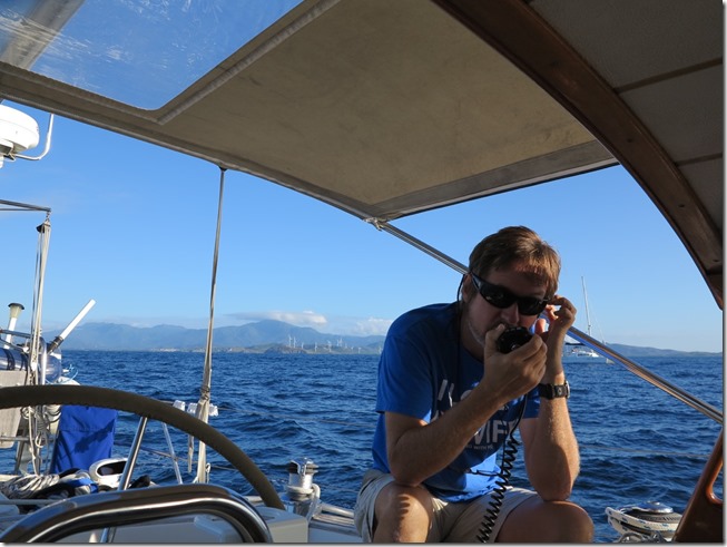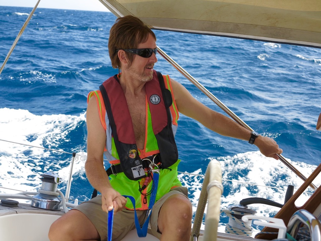 Mark is probably talking to UNO, the sailing catamaran right behind him, as we sailed from Green Beach, Isla de Vieques, Spanish Virgin Islands (SVI) to Sun Bay, Vieques, SVI. We caught up with s/v Ally Cat there.