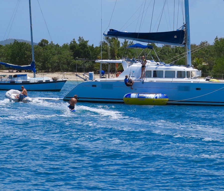 Steve is pulling Noah on the boogie board while Jacob swings out from a line and jumps on the water trampoline as Ally watches while we were anchored in Green Beach, Vieques SVI! I still haven’t gotten a chance to try out the tramp, but I I hope I can at some point!