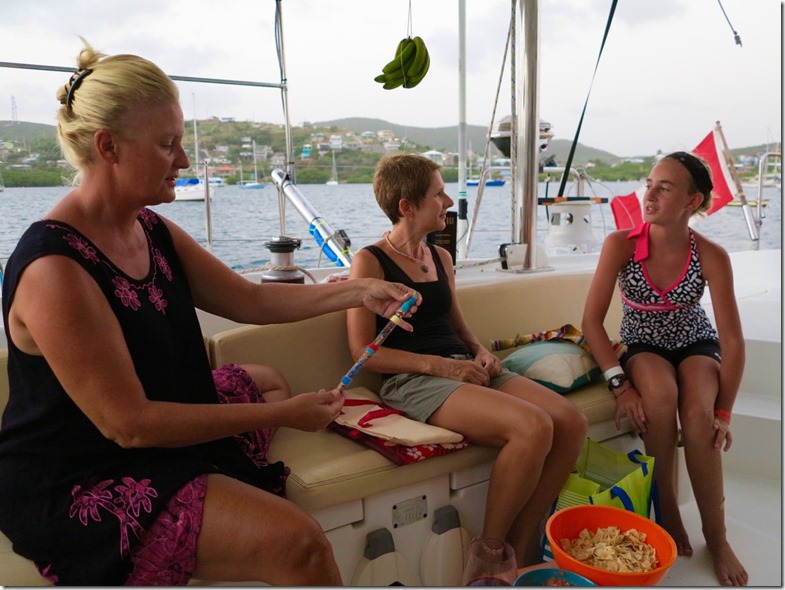 We celebrated Steve’s 43rd birthday aboard s/v Nancy Lu with an adults-only meal along with s/v Ally Cat our first night anchored in Sun Bay, Vieques, SVI. The kids had a movie night that night on UNO! We’ve had other meals together including a big potluck meal on UNO back in Dewey and a nice ladies-only breakfast on Ally Cat just this morning in Francis Bay, USVI! We missed Sue this morning because she and Steve had taken ALL the kids (Colleen-s/v Glass Slipper, Ally-s/v Ally Cat, and Jacob and Noah-s/v UNO) back to St. Thomas for a movie in an actual theater. This special outing turned an unexpected necessary working boat trip for UNO into a fun sleepover adventure for the kids! This is not the first time that Sue has shown her impressive “fun-mom skills”!