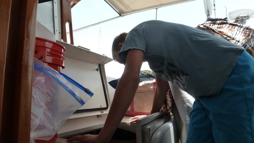 This is Jacob from s/v UNO looking through our cockpit locker down into our engine room on Nancy Lu as his dad, Steve, is wedged in the engine room fishing an impeller fin out of the generator heat exchanger…the generator lives to run another day!