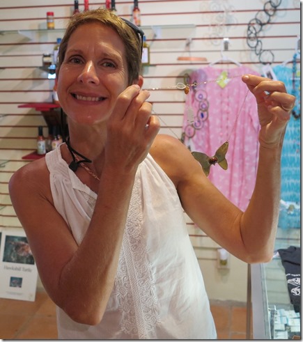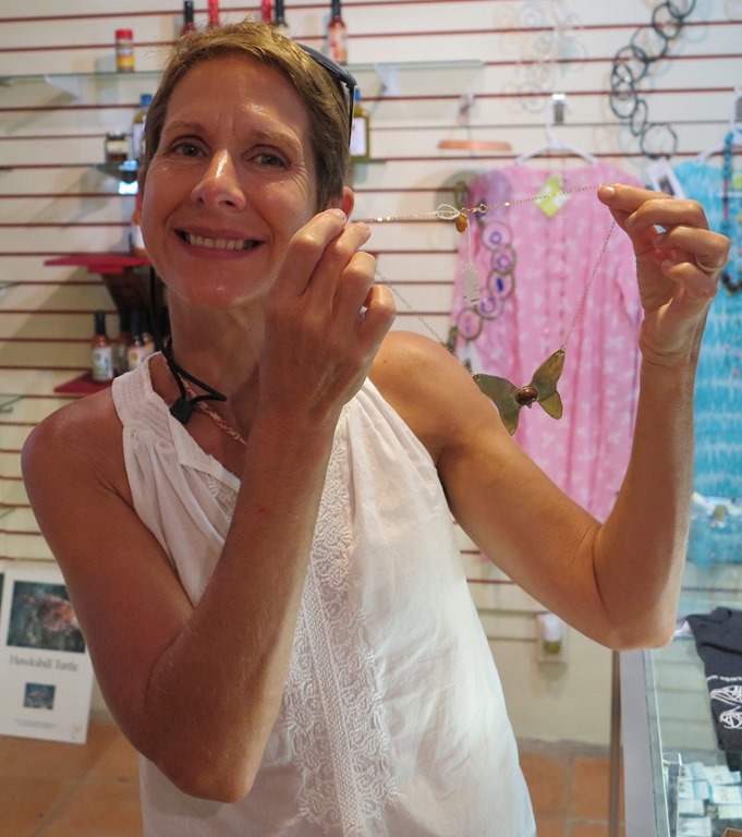 Back in April, in the little town of Esperanza, Vieques, SVI, Mark bought me a beautiful necklace crafted by a local artist! This was his early birthday/Mother’s Day gift to me! It is crafted from brass and a semi-precious sparkly stone of some sort. I picked it out at the gift shop of a little museum there. I love it and have worn it quite a bit since then!