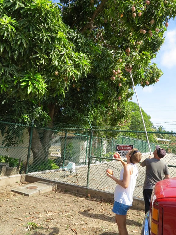 On the way to the grocery store where we got the ice cream, we came across two huge mango trees heavily laden with fruit. As we were staring up into the branches, a man with a special grabber asked us if we would like him to pick a couple for us. We said YES!! I don’t know which was better the mangos or the chocolate ice cream!!