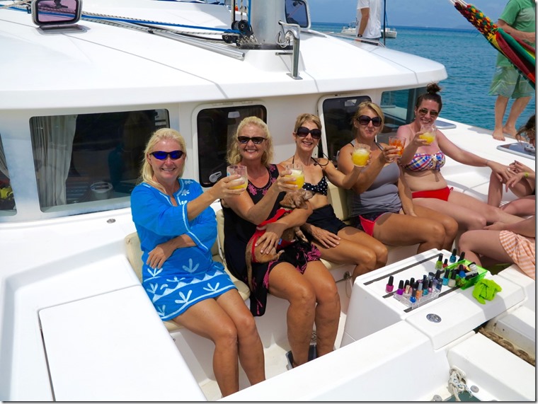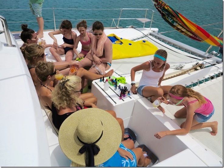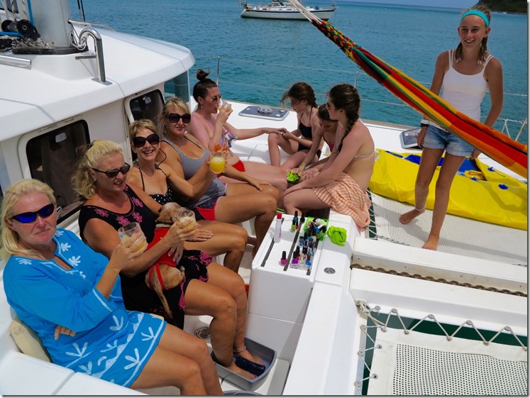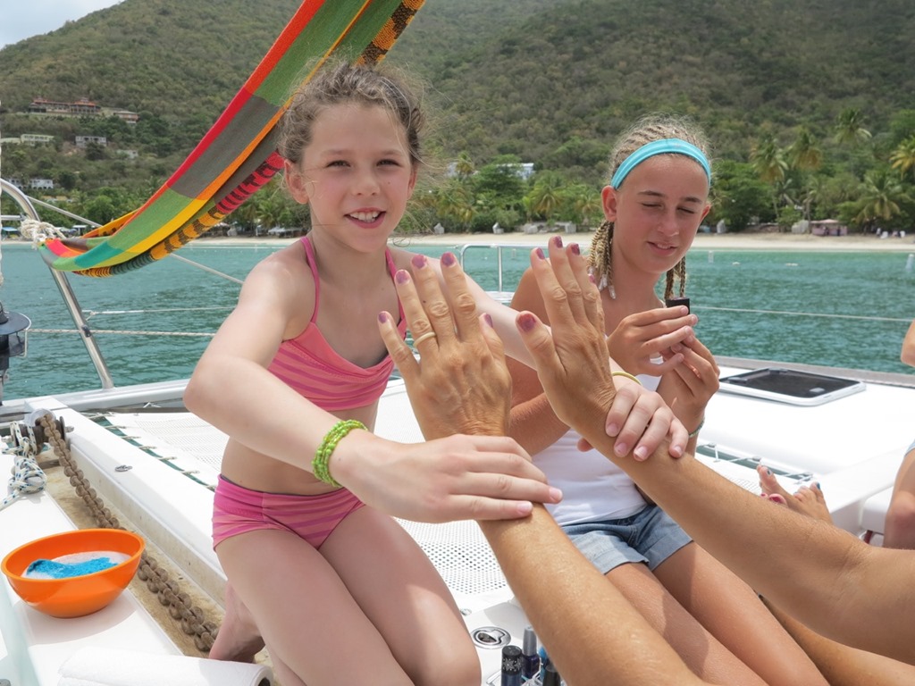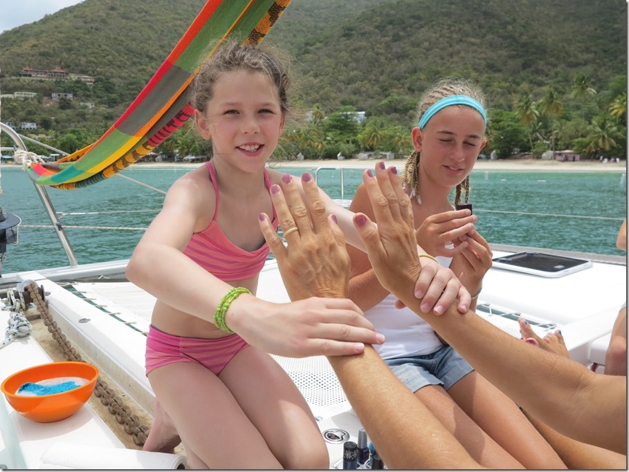 May 10 was quite a special day for me!! I woke up to a beautiful morning anchored in Cane Garden Bay,Tortola,BVI along with our buddy boats. I was so honored to be included in a Mother’s Day event put on by all the kids of our buddy boats, UNO, Ally Cat, and Glass Slipper, PLUS the four kids visiting s/v UNO with their parents!! It was the cutest, most heartwarming and delightful happening on a boat I’ve had the pleasure to have been a part! Coleen of s/v Glass Slipper met me with a refreshing glass of juice as I stepped aboard UNO from my dinghy. She then led me to the bow where the girls had set up a mani/pedi station! They had also set up hammocks for the moms and laid out towels to warm in the sun, ready for us to dry ourselves in case we wanted to go for a swim. The pampering began with our feet soaking in bowls of water as we soaked in the girls’ cuteness! My technician was Sophie, one of the visiting daughters of UNOs guests, Michelle and Jube. The boys of the bunch participated, too! They topped off our drinks and helped make and serve us our choice of grilled cheese or tuna melt sandwiches for lunch! What a special morning!! I think Steve on UNO deserves a thank you, as well as the children, for helping them pull off such a wonderful celebration for us moms! Not only did I enjoy being pampered by some awesome kids, I also enjoyed the company of some awesome fellow-moms. The only thing that could have made the Mother’s Day celebration more complete would have been to see the faces of my own three wonderful kids!