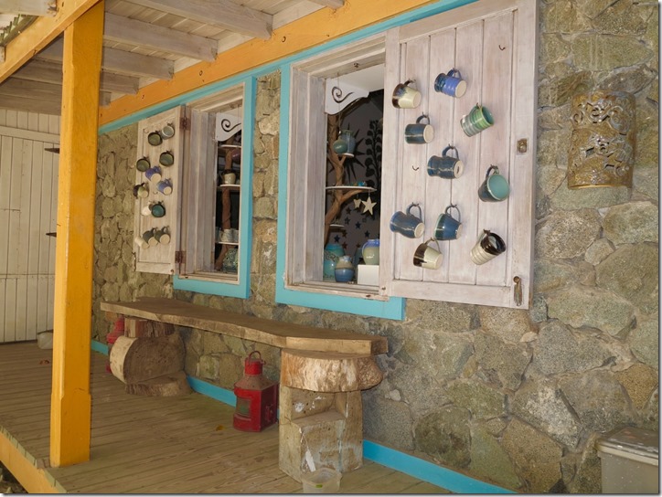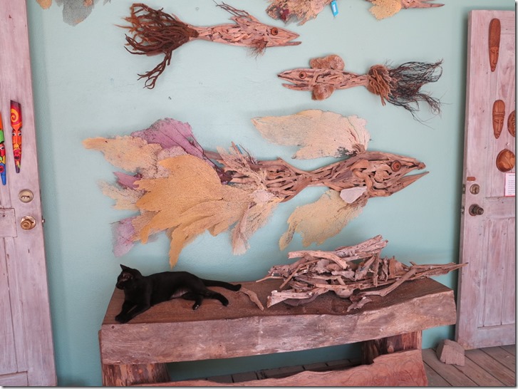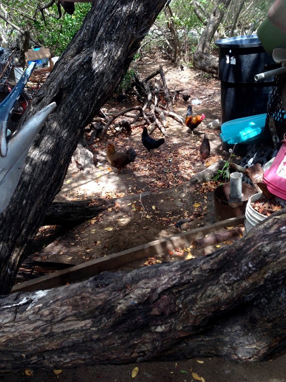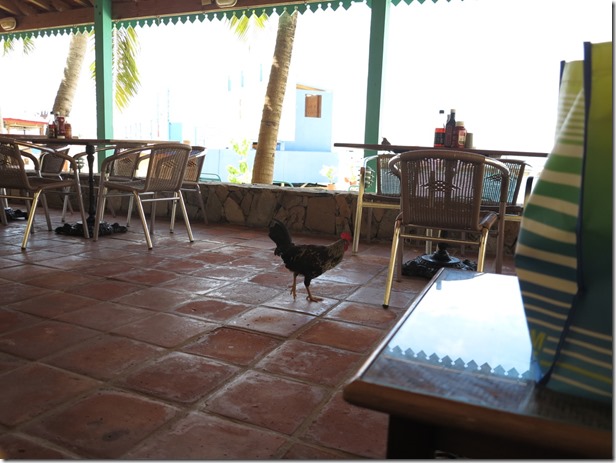 I also never get tired of seeing chickens wandering around every where. The rooster in the first photo was at a posh resort’s outdoor restaurant at Leverick Bay, BVI. The hen in the next picture was at the same restaurant. The chickens in the photo on the right were at Aragorn’s Art Studio on Tortola, BVI.