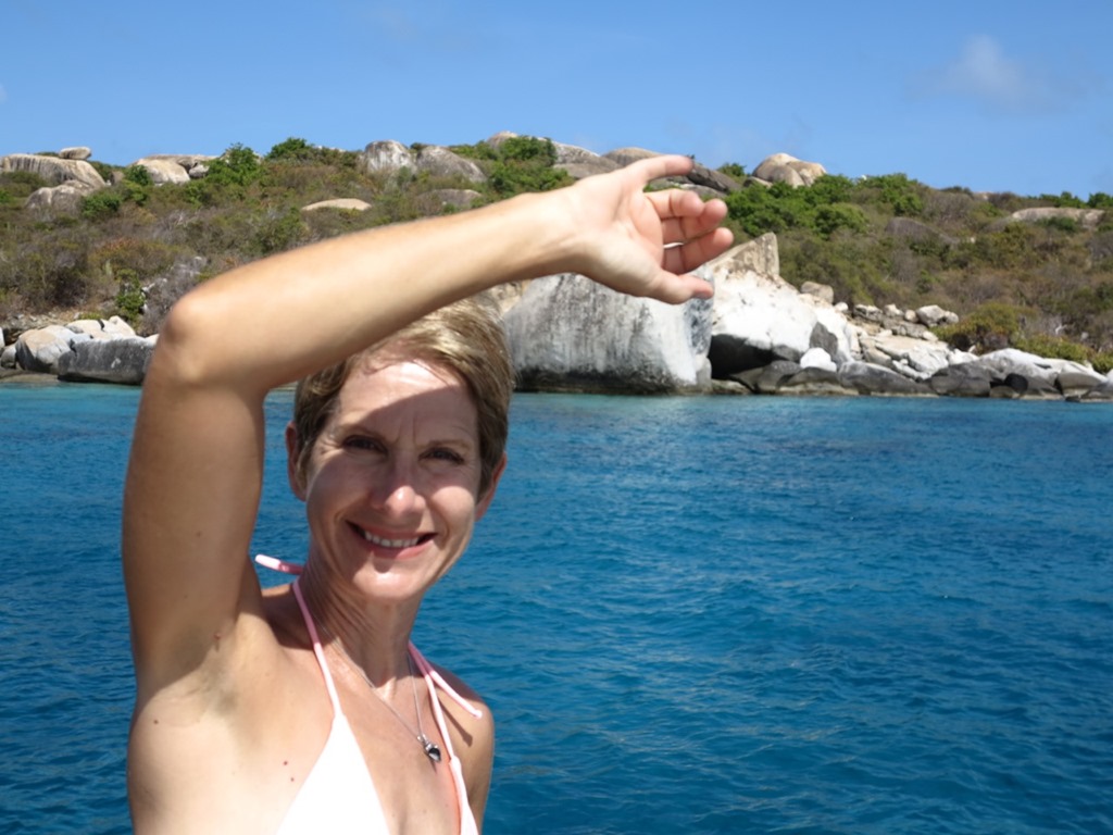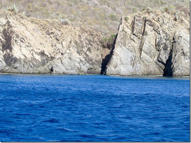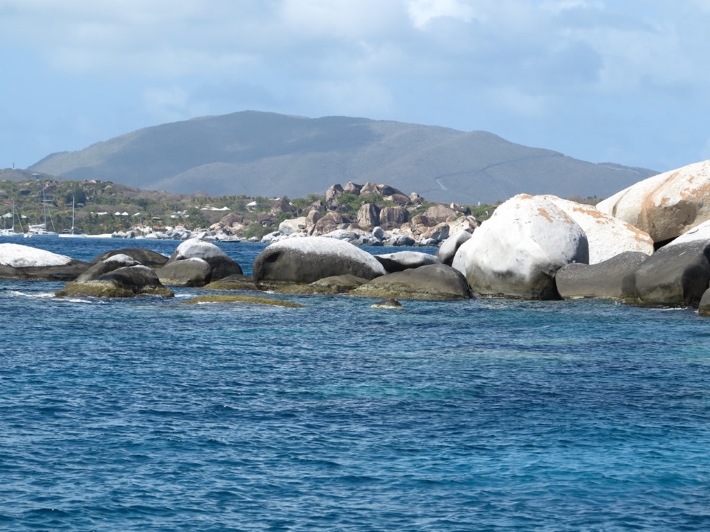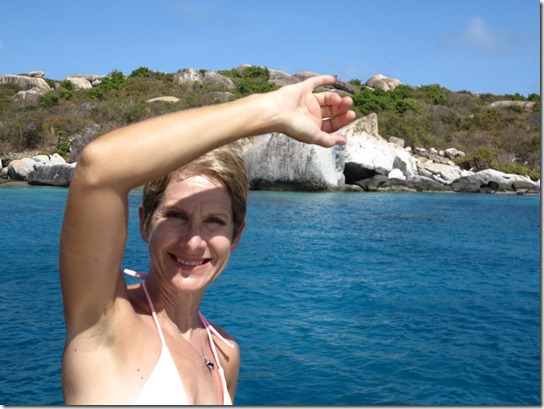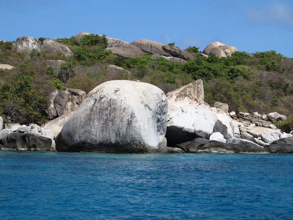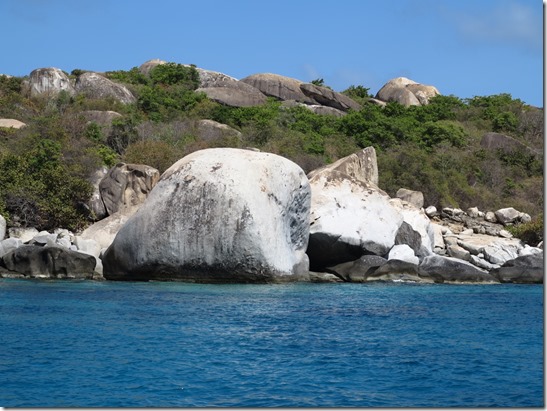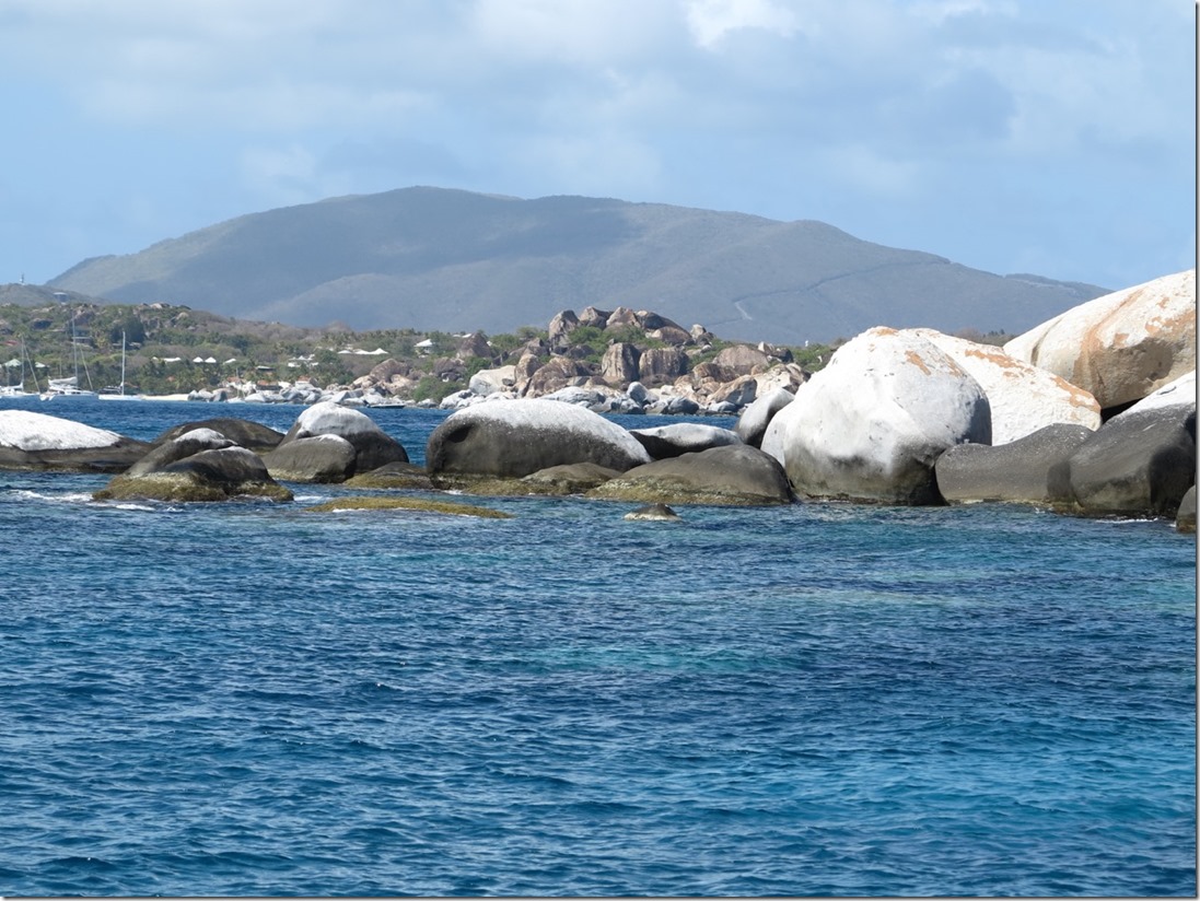 We did a short day anchorage at Fallen Jerusalem. One of the main tourist attractions in the British Virgin Islands are the Baths on Virgin Gorda, and it is well worth the visit. We’ve been there 4 times, so we decided to pick up a mooring for a little while at a little island just southwest of there. You can see the famed Baths in the background of the last picture. The boulders on Fallen Jerusalem don’t form quite as interesting tunnels, caves and pools, but we were the ONLY ones there, and the snorkeling was nice. We may or may not have worn out swimsuits