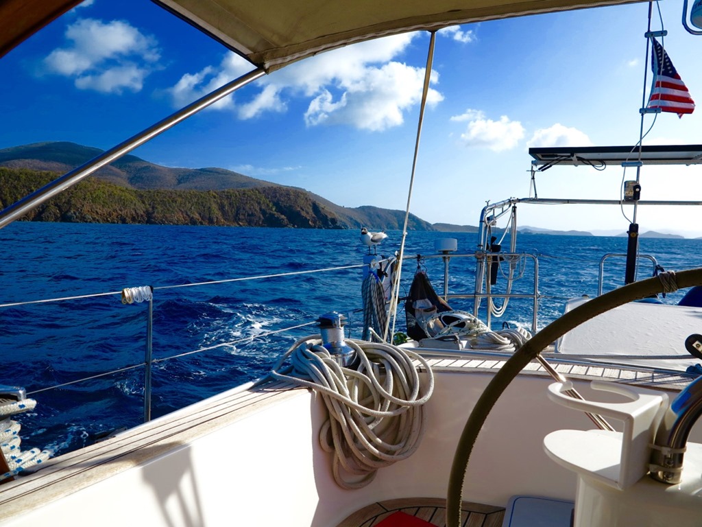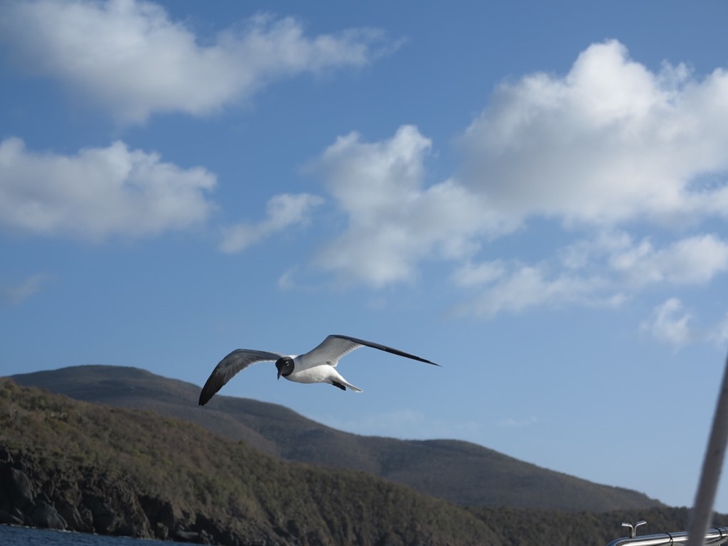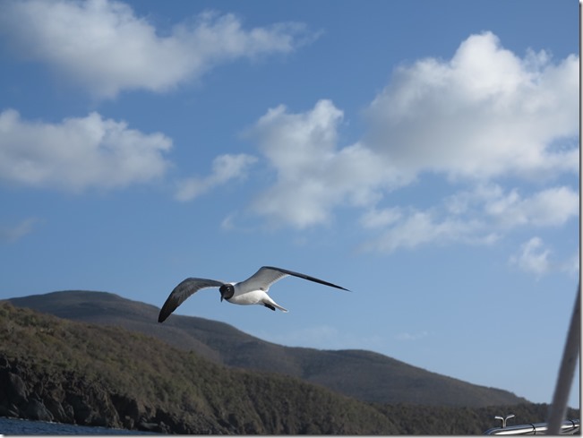 This sea gull flew right along with Nancy Lu for a while as we reluctantly left our anchorage at Long Bay on Virgin Gorda, British Virgin Islands (BVI). Every once in a while he would take a little rest on our man-overboard-module on our stern rail.