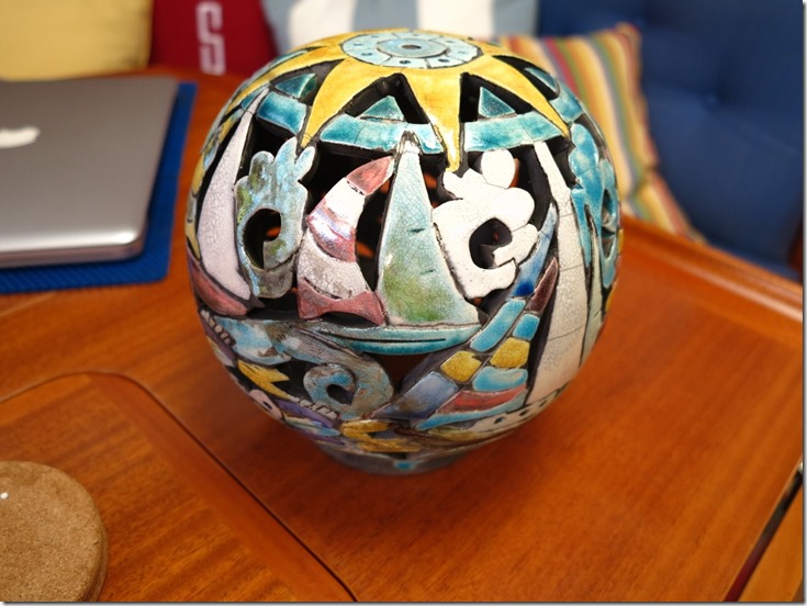 I also got this SPECIAL piece of art. It’s a birthday present from my parent ‘cause I used the birthday money they gave me, YAY!! This piece of pottery, which is different on every side, was crafted by a local artist and was inspired by the artist Aragorn’s gigantic fireballs made from old metal buoys. You’ll find a link to learn more about him further down in this post. I plan to use my Christmas money from Mama and Daddy to purchase an end table so that I’ll have a suitable place to display it at home!!