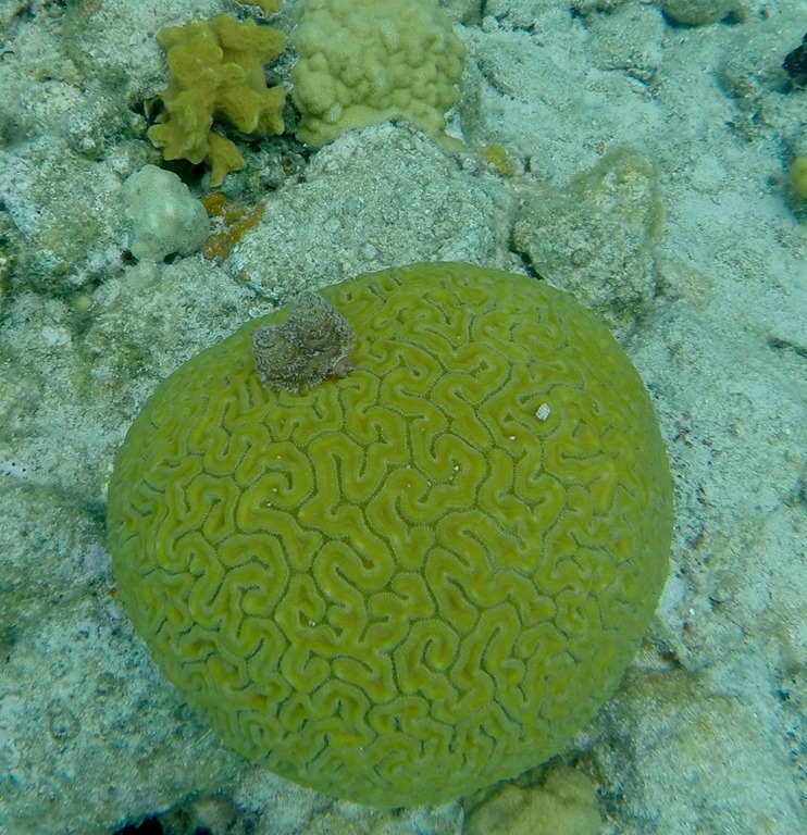 Brain Coral with two little Christmas Tree Tube Worms living on it. See that white dot to the right on the Brain Coral…That’s a tube worm that has sucked himself back in his tube, hehehe.