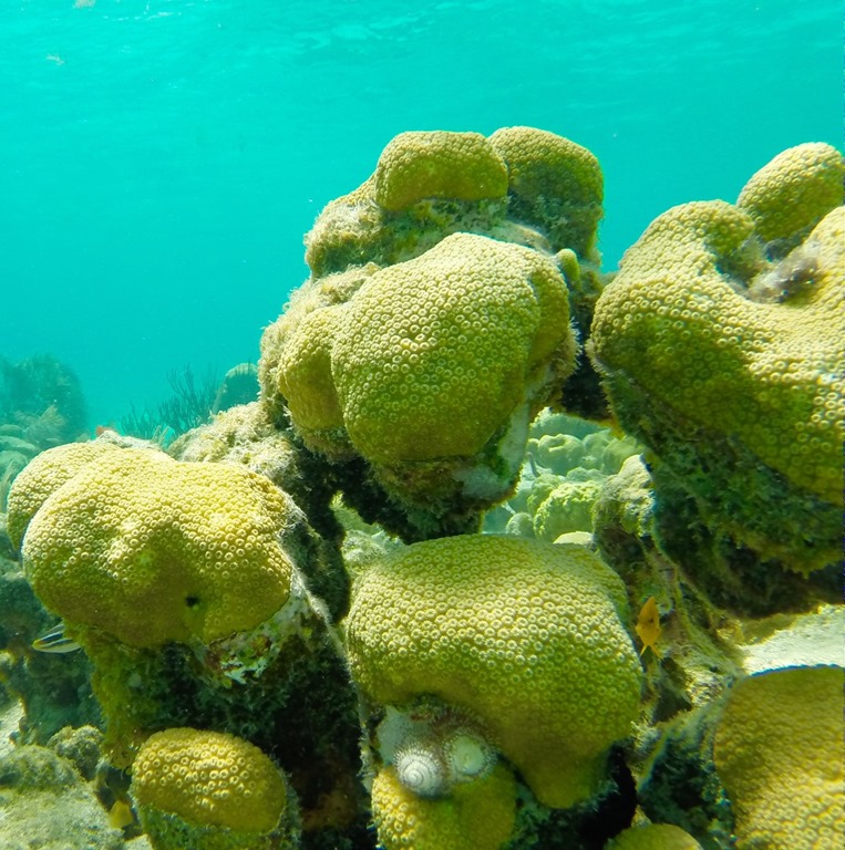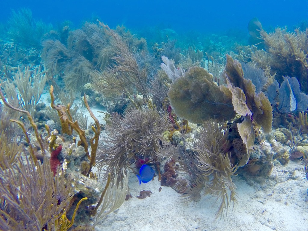 This picture was taken at Henley Cay after the girls left—lots of healthy coral there! See the Blue Tang swimming among the coral.