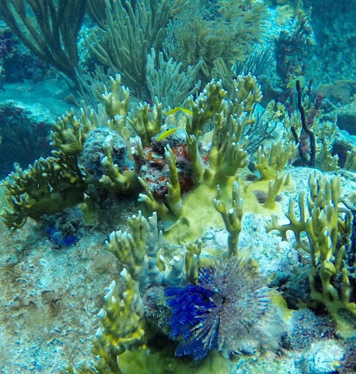 The purple (well it was purple in real life—it looks more blue in the photo) tube looking creature is a Turncate, but the flower looking thing next to it is a tube worm. the mustard colored coral with white tips is Fire Coral.