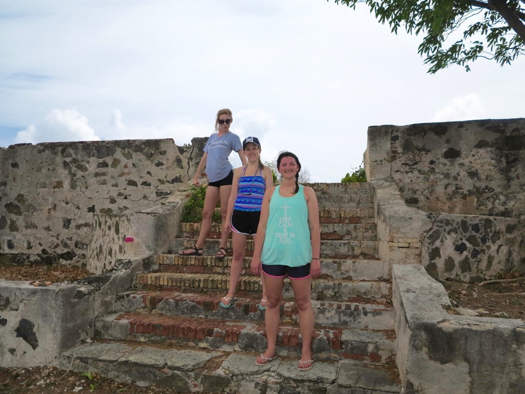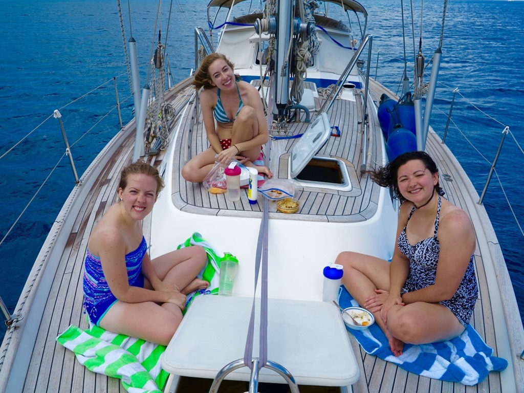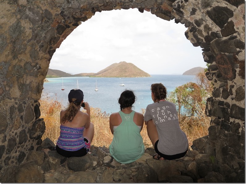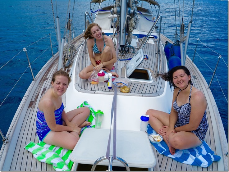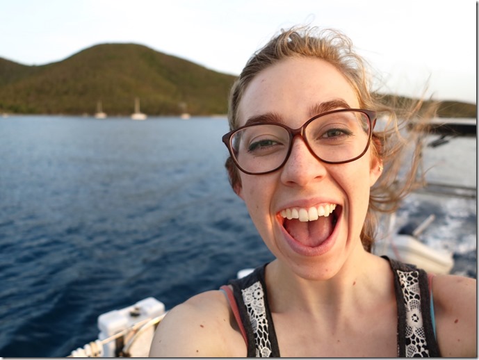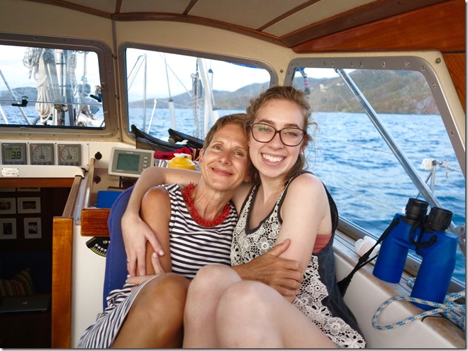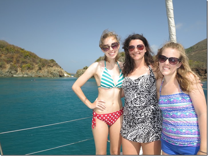 The girls’ first morning “wake up call” at Francis Bay was Mark alerting them to the fact that there was a big sea turtle right beside the boat! All the girls came running to see. Kay didn’t have to run far since she slept out in the cockpit the first night of the girls’ VIP (Vacation in Paradise) and a couple other nights to take full advantage of the stars overhead!