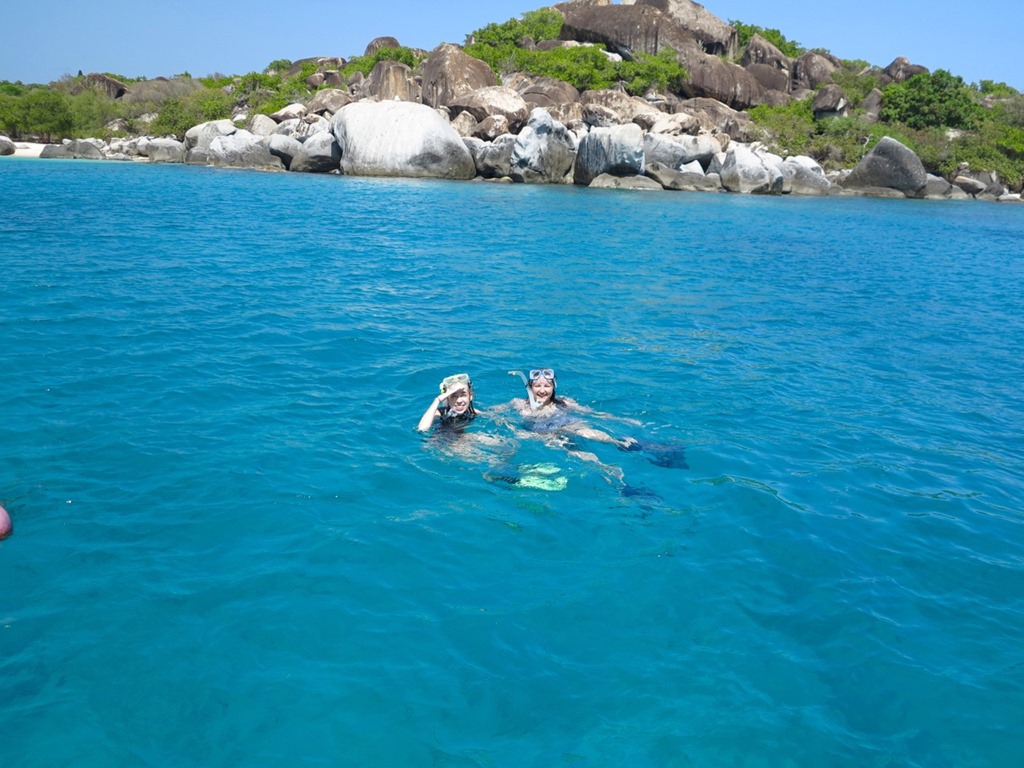 We all went snorkeling at The Baths, and it was awesome. As you look out toward the deeper water, the huge boulders that you see are “just the tip of the iceberg”. We could see the whole thing snorkeling! The snorkeling was awesome when we went a little bit beyond the beaten path. That’s the beauty of being your own cruise director on your own boat!