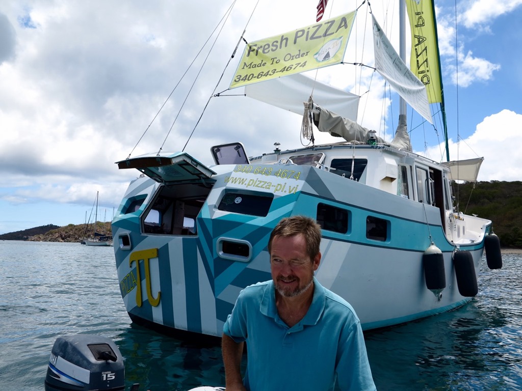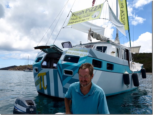 Oh, and for their last lunch aboard Nancy Lu, while moored at Christmas Cove, Great St. James Island, USVI we treated the girls to PIZZA from Pizza Pi!! It’s run by two transplanted NY, NY Chicks, and is open for business in Christmas Cove on most week days from 11am to sunset! Kay, the newly graduated Suma Cum Laude math major and soon-to-be high school math teacher liked the name! She dinghied over with Capt. Mark to order our pizza.