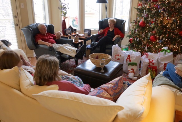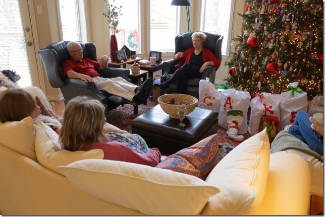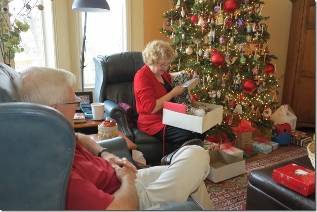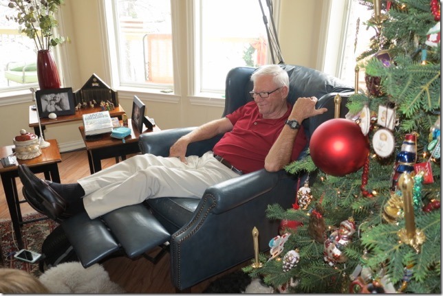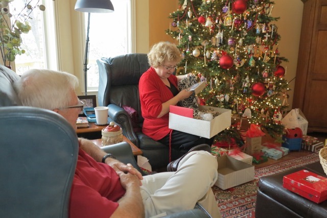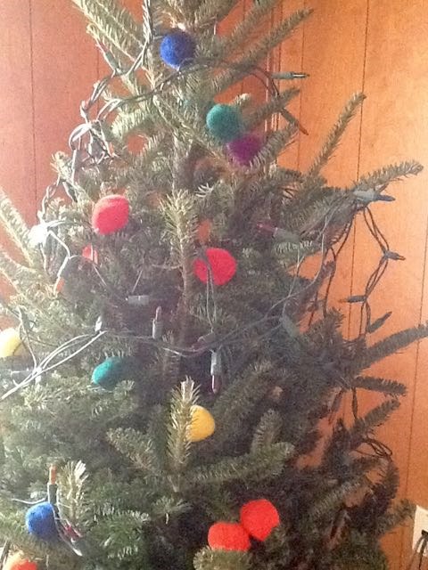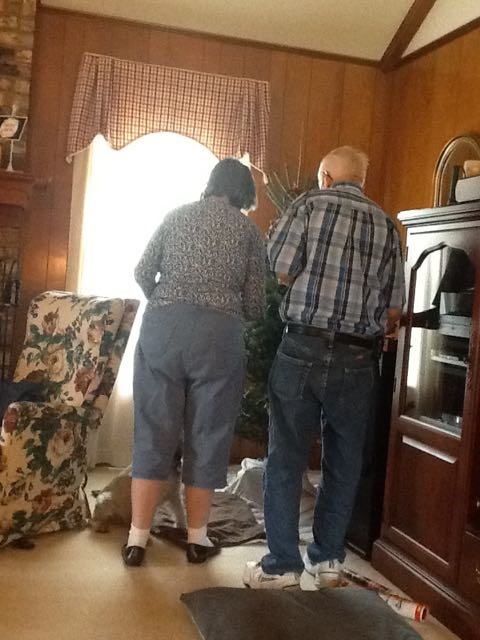 After Nanaw’s funeral, we travelled to go see Mark’s parents, David and Lunell. Nanaw was Lunell’s beloved mother, but because of her Alzheimer’s, she and David were unable to attend the funeral. At their house, we celebrated a late Christmas and early birthday for David. Each time we visit them, I try to come up with some activity for Lunell that David can do with her. David had gotten this little Christmas tree for them and strung it with lights, but it had no ornaments. I found these pompoms, which I had bought another time, in the laundry room. I tried out placing them in the tree to see how hard that would be….easy peasy, so I put some in a basket near the tree and told David about it. He and Lunell worked together to decorate the tree. It was a precious sight to see them sharing this moment together “…In sickness and in health”. They are a shining example to the rest of their family!!