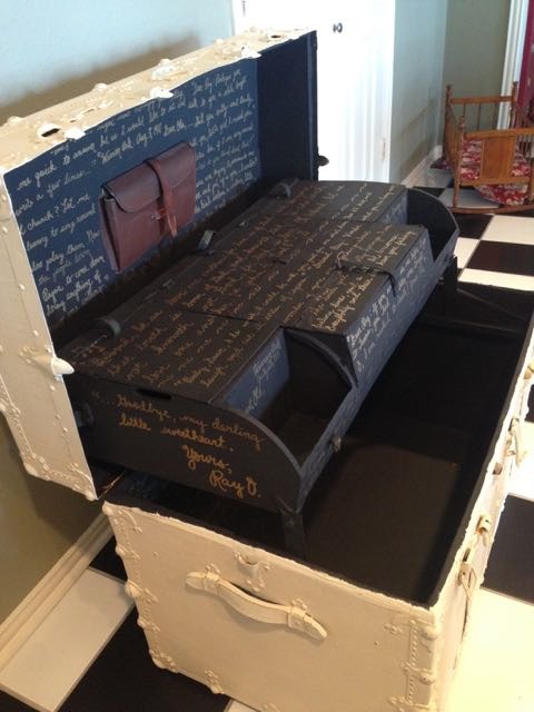 Another sentimental project that I did during the summer was refinishing this steamer trunk that Mama gave me and we brought home after Grandmama’s funeral. Grandmama had it in her house, but it had first belonged to her mother, my Great Grandmother, Mammaw. I decorated the inside of the trunk with the painted words of a bible verse (1 John 4:7 & 8) that Grandmama taught my sister and me in the form of a song (which she sang at Grandmama’s funeral), but for the most part, the inside of the trunk is decorated with painted words from letters that Mammaw and Pappaw wrote to each other before they were married. The first letter in the collection of copies of the letters that I am so grateful to have was written in 1911. Refinishing the trunk was a labor of love!