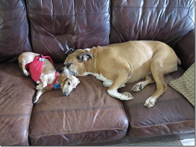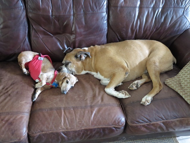 Timmy had to share Annie’s couch while at Uncle Alan’s house —two old dog-cousins.