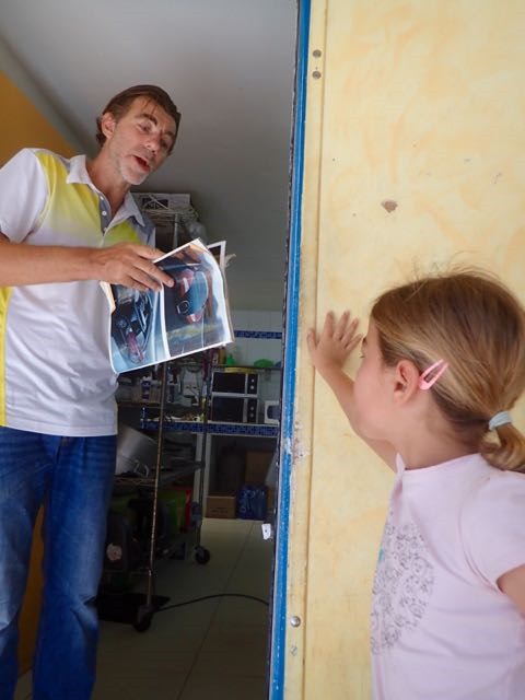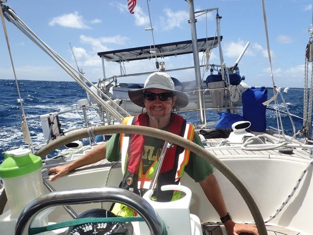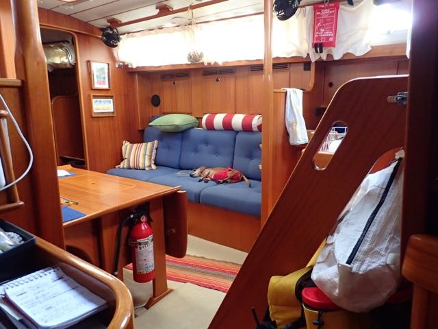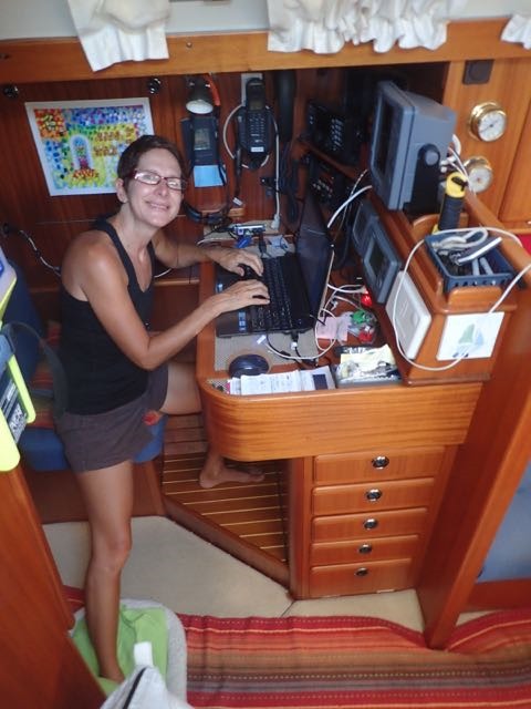 I’m writing this down at the navigation station as we sail from Dominica to Martinique at 6 knots, heeled over to starboard at 10 to 15 degrees. My right foot is braced against the wall across the narrow hall that leads back to the aft cabin. Well, let me just get Captain Mark to take a picture…