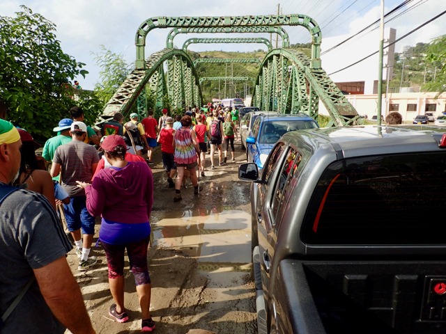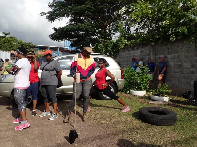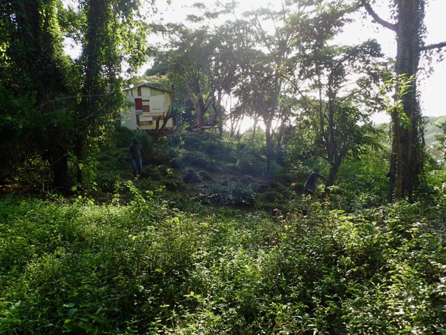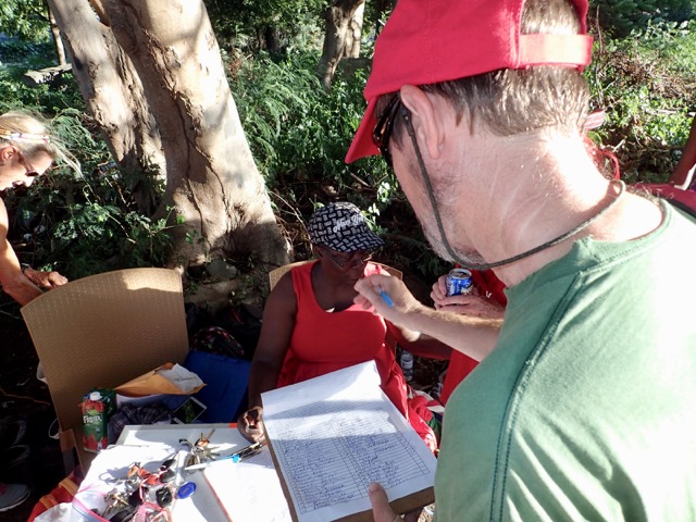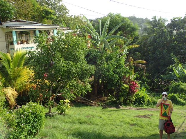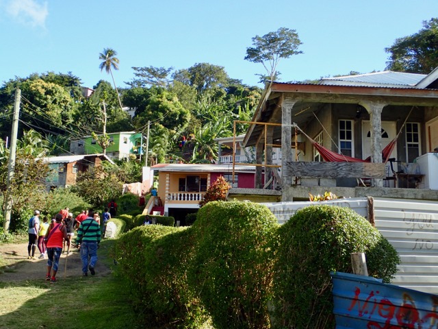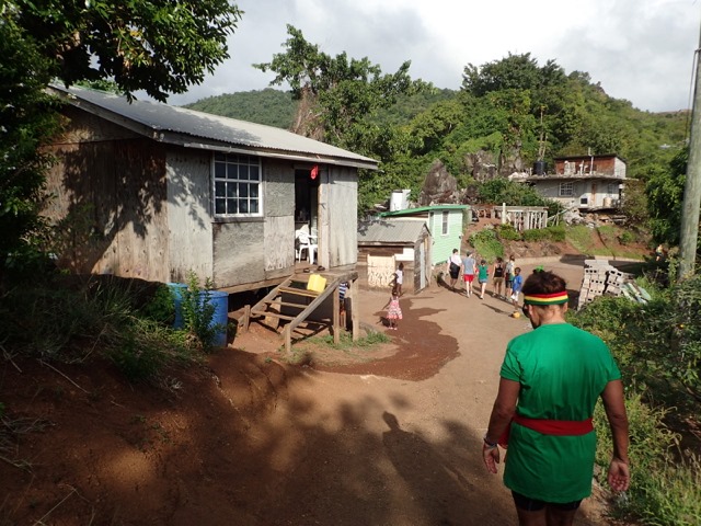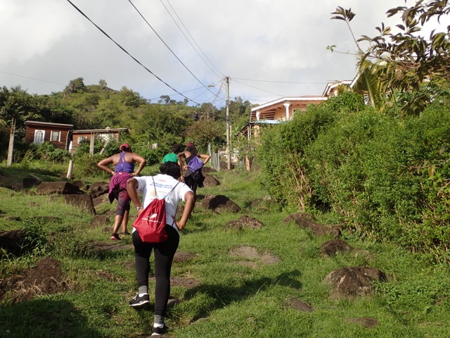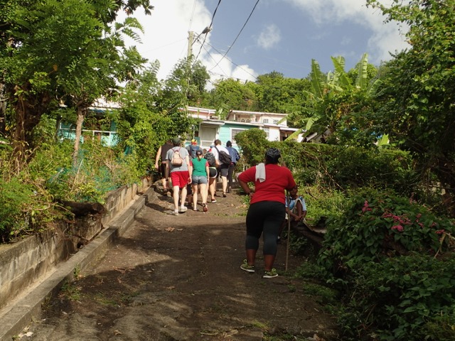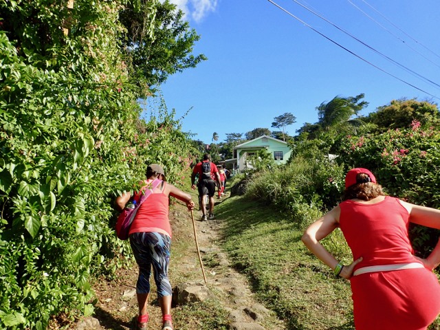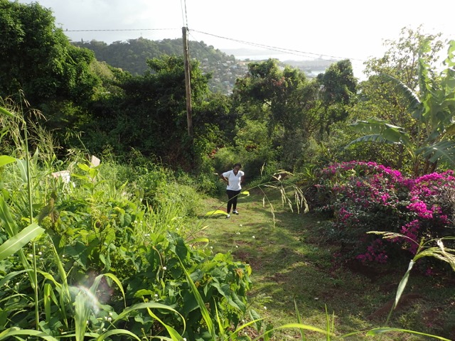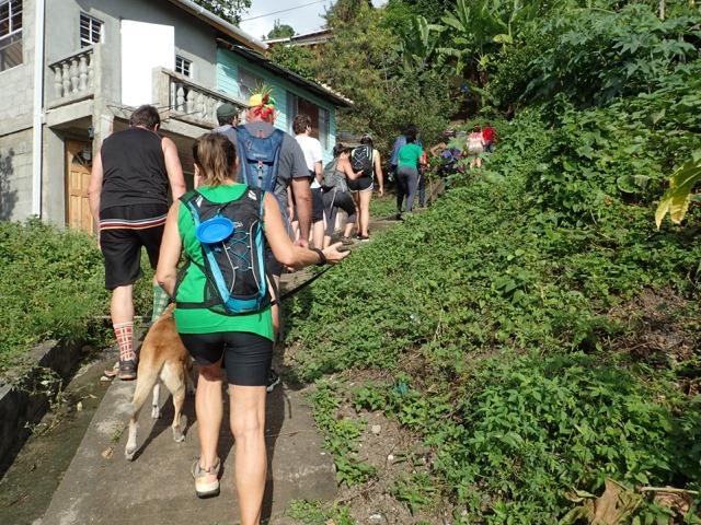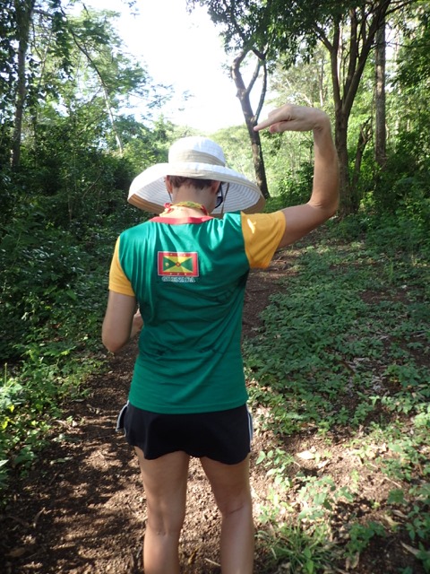 Saturdays are Hash days in Grenada!  We went on two hashes while we were there.  I’ll explain:  This is another regular event to which Shademan offers transportation.  A Hash is a trail-running/walking event done in many countries around the world put on by the, now, worldwide club called Hash House Harriers.  I Googled  “What is a hash, Grenada?” to learn enough about it so that I pretty much knew what Mark and I were getting ourselves into.  Let me just say, right off the bat, that it has nothing to do with hashish, haha!  Basically, anyone is welcome to run or walk in a hash.  In Grenada, they meet at a different, pre-determined place each week, have a little opening ceremony, run or walk a trail that takes the participants over hill and dale ending up back where you started, have a closing ceremony, and finally, enjoy food and drink.  It’s really more like a trail-following game with special symbols and lingo used to play.  Their motto is:  “We’re a drinking club with a running problem”.  This didn’t stop us nondrinkers.  It sounded like fun way to see more of Grenada, and we were assured that there would be nonalcoholic beverages, as well.