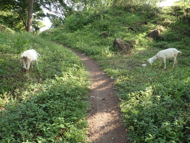 Their goats are tethered beside the trail.