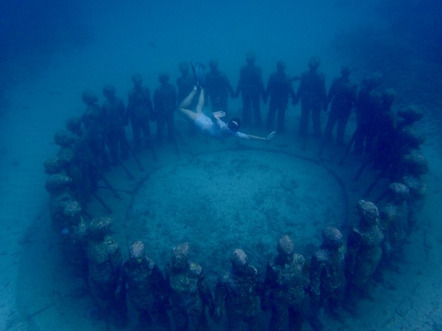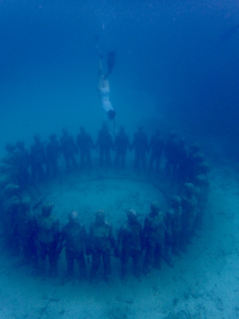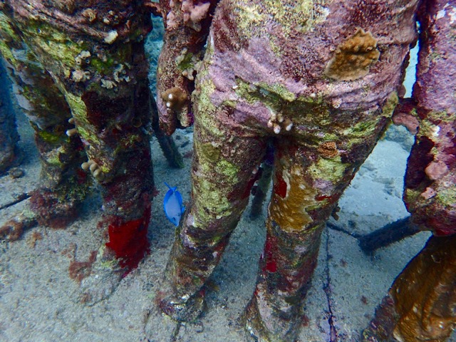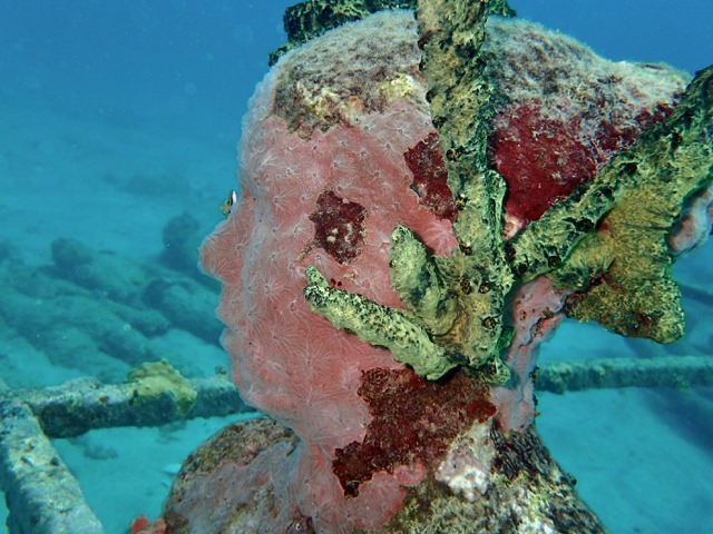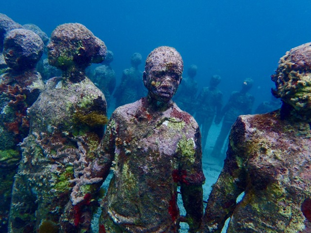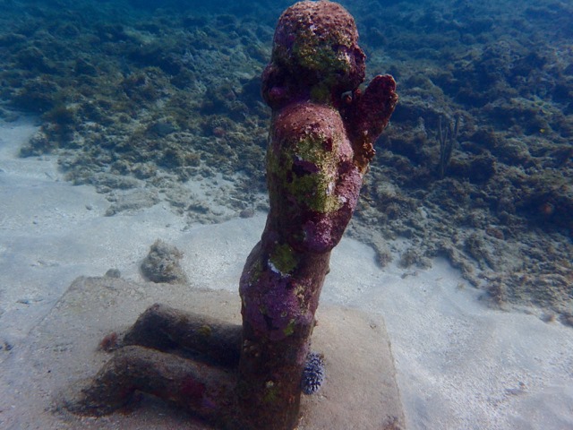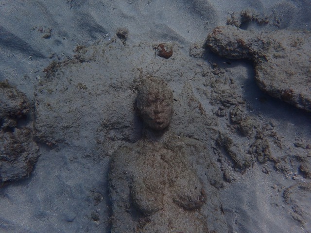 This picture shows part of the most famous of the sculptures by British sculptor, Jason deCaires Taylor, in the park.  She is part of a circle of children holding hands.  The complete sculpture is called “Vicissitudes”, but it is more commonly called “Circle of Children” by locals.  Only a few of the children are still standing.  It was damaged by a storm surge, and later, replaced with another circle of children, also called “Vicissitudes”.  Isn’t she gorgeous?