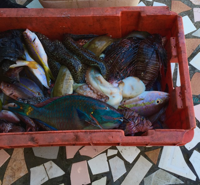 I see Parrotfish, Lionfish, Moray Eel, Octopus, and others in this crate, but Mark brought us home some fresh Mahi Mahi!