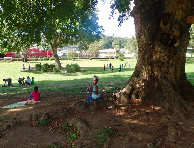 we visited the Botanical Garden, which we experienced to be more like a beautiful city park; although, I know that there is more to it. I LOVED seeing the kids playing under the shade of the tree. One little girl was playing with her dolls, and the other little girl was playing doctor, using her toy stethoscope—brought back childhood memories! Other kids were playing sports games. We asked some adults why so many kids were out playing on a school day. They explained that it was Friday afternoon, and they were, basically, getting a jump on the weekend. Later, I noticed that a school backed right up to the Botanical Garden—what a great playground!