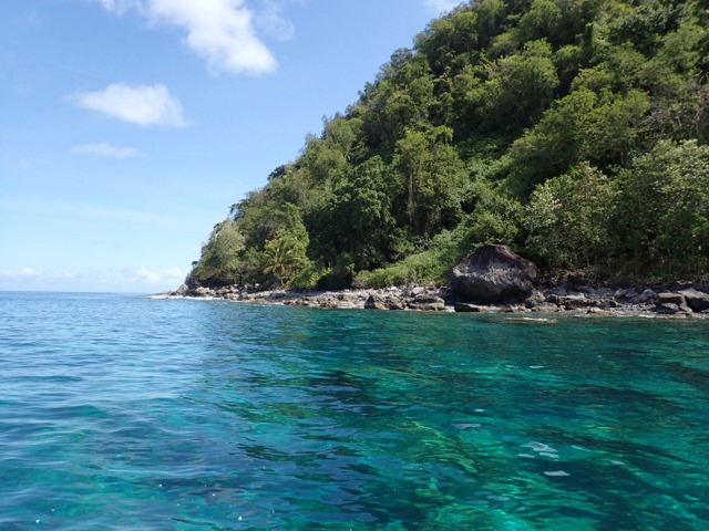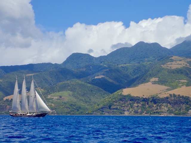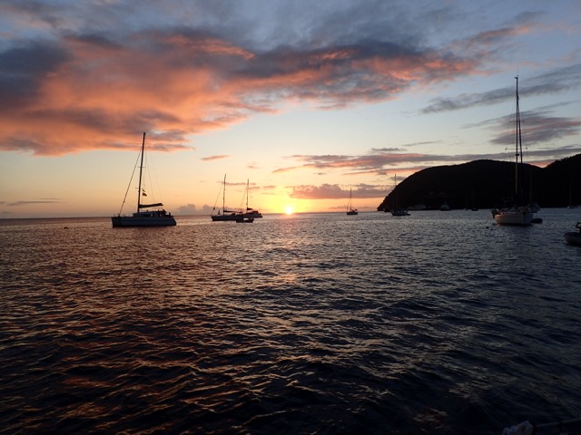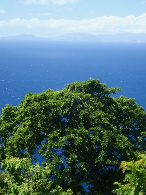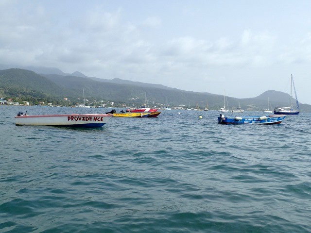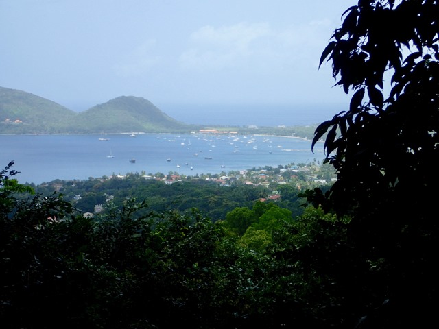 A view back to our anchorage, Prince Rupert Bay, and West Cabrit where you can see the red roofs of Fort Shirley