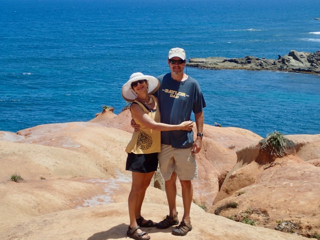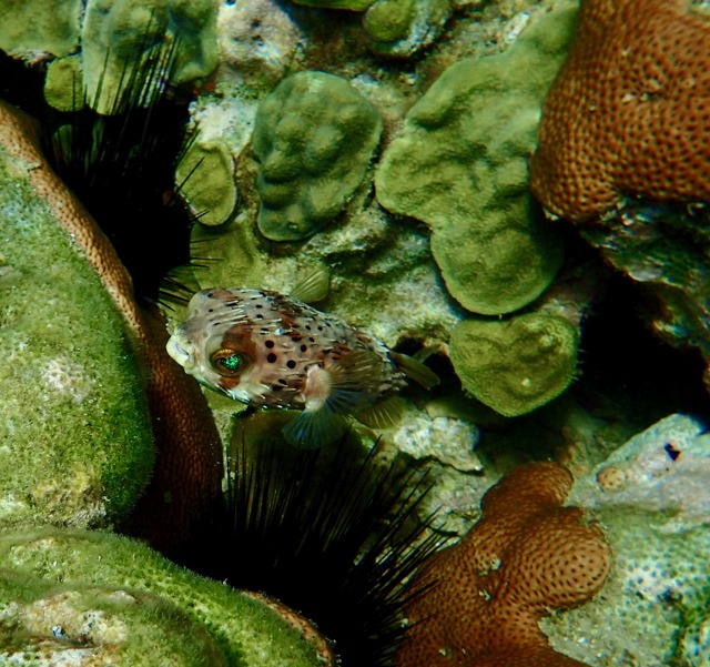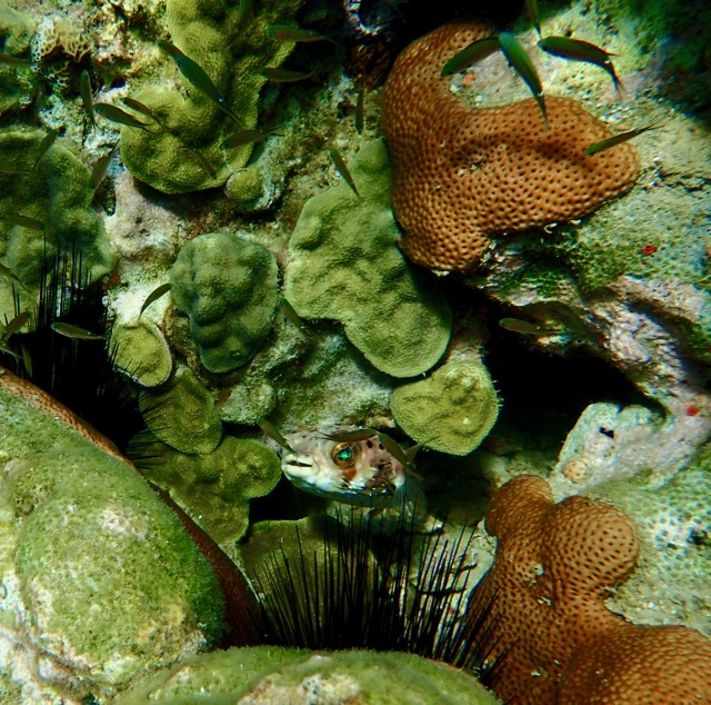 ) was about 6 inches long, and I’m sooo glad I didn’t miss him!! I’ve never seen one before. He is in the Puffer Fish family, of which, I’ve seen the big Porcupine Fish many times. I think they’re really cute! This little guy was more WEIRD than cute. I mean, check out those freaky, sparkly, green eyes!! They were that sparkly and crazy looking no matter which way he turned; the sun reflecting in them didn’t make a difference. This Balloon Fish was not skittish at all. I was able to get very close. After I had had my fill of trying to get the perfect picture, I tried to scare him so I could see him puff up (I know that’s not right; I really suspected he would not be frightened no matter what I did). So I waved my camera at him and may have even touched him, but he was unfazed and just swam away. Of course, I got Mark to come over and see this little guy, and all the time we spent with him, put us way behind our group, but we caught up!