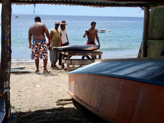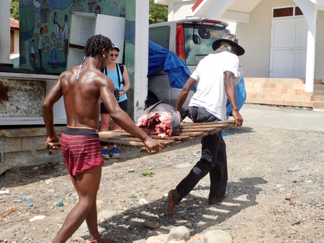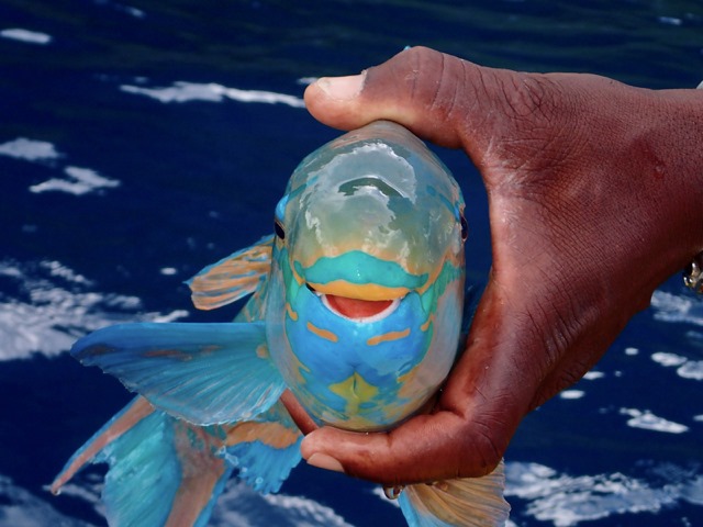 ) looks content, happy, even, but he’s not. After we got back in Alexis’ boat, we saw him floating on the surface, near death. Alexis picked him up and motored over to one of his friend’s boats whom we saw fishing. Alexis added him to his friend’s catch, so this Parrotfish’s death wouldn’t be in vain.