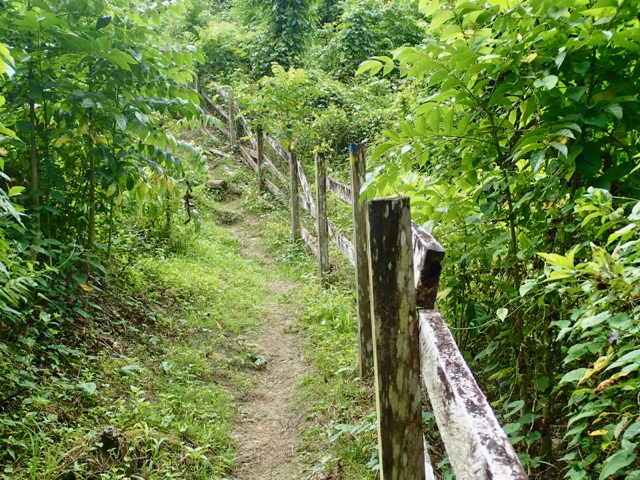 About 3 hours into our hike, after many steep climbs, the steepest climb is up ahead. There is a long rope that you can barely see to make the climb possible.