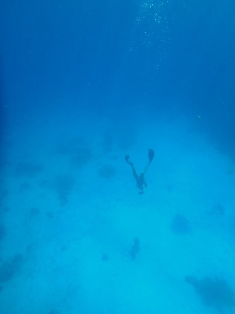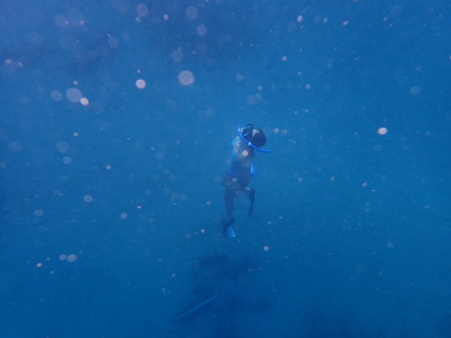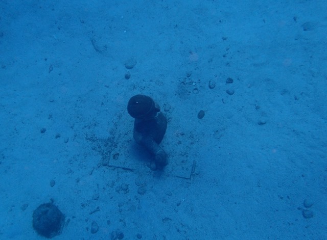 I pointed out the bust of Jacques Cousteau to Kendra. It’s kind of hard to find since it’s smallish and pretty deep (about 40 feet). She took a picture of me diving to get…