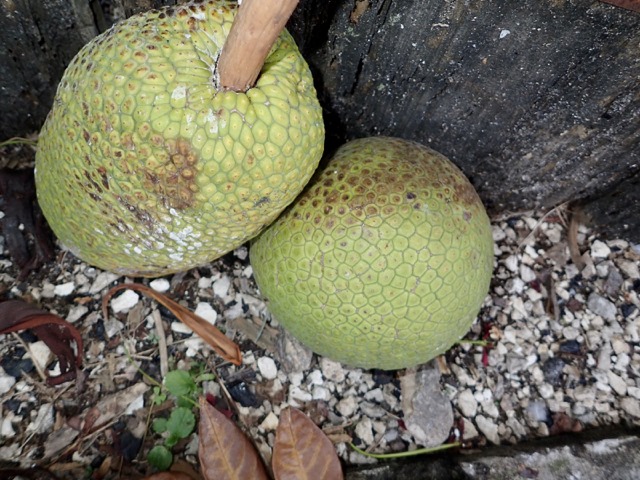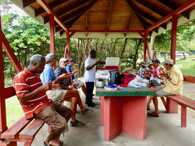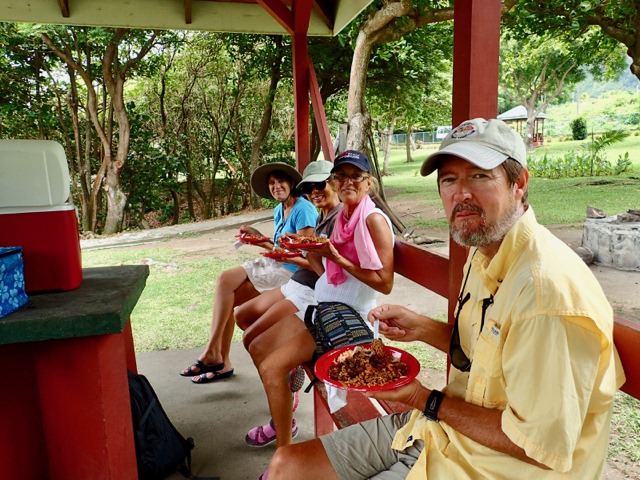 Along the way, Bob found some breadfruit suitable for cooking.  He and Anita had us over for dinner later, in Dominica, so I could learn how to cook it.  It tastes just like potatoes but grows on a tree.  He fixed it like mashed potatoes, but I’ve had it fixed like potato salad, as well.  DELICIOUS!