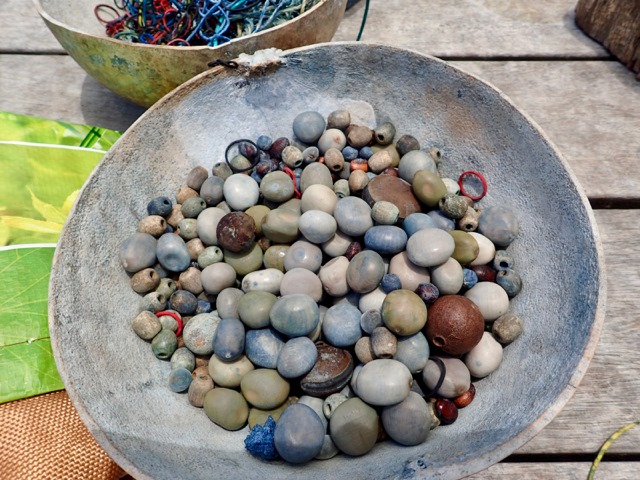 She uses all sorts of natural things to tie around in order to create designs with the dye.  I see a hamburger bean in there!
