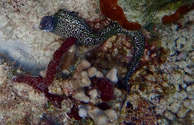 When I would dive down close, they would retract into their holes.  I remembered Bob telling me that he uses a landscape, uh, I mean seascape setting on his camera just like mine, the Olympus Tough.  I was skeptical of getting a good quality photo, but I tried it so that I could capture the eels as they acted naturally—it worked!  I use that setting more now, but I still like to dive down and get the close ups.