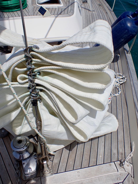 We had a sail bag made for our staysail at Grenadine Sails (we had them make sun protection for our headsail when we were on our way north) so we can leave it out on the deck most of the time for easy deployment.