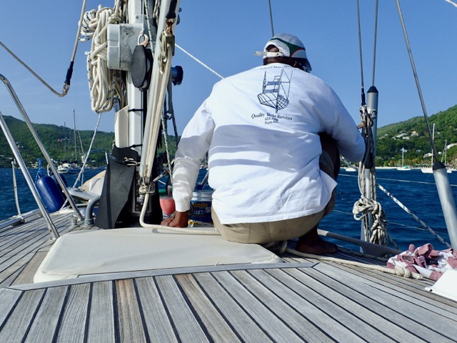 We had Winfield Sargeant clean all our stainless and wax our hull while we were here.  We met him and his wife in church on Sunday.  They were in the pew in front of us and turned around to tell us the page numbers of some of the recitations that weren’t in the order of worship.  Turns out, he is the younger brother of Lawson Sargeant, the famous model boat builder who runs the Bequia Maritime Museum in town that I visited earlier this year!  Winfield enjoyed the smoothie that I made for him and Mark while he worked.  Nancy Lu looks PURDY!