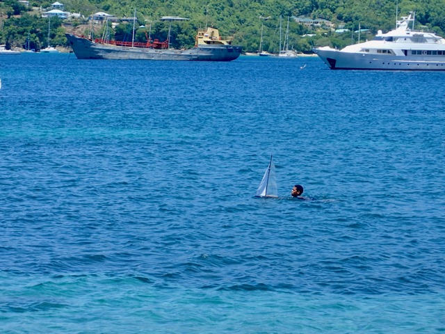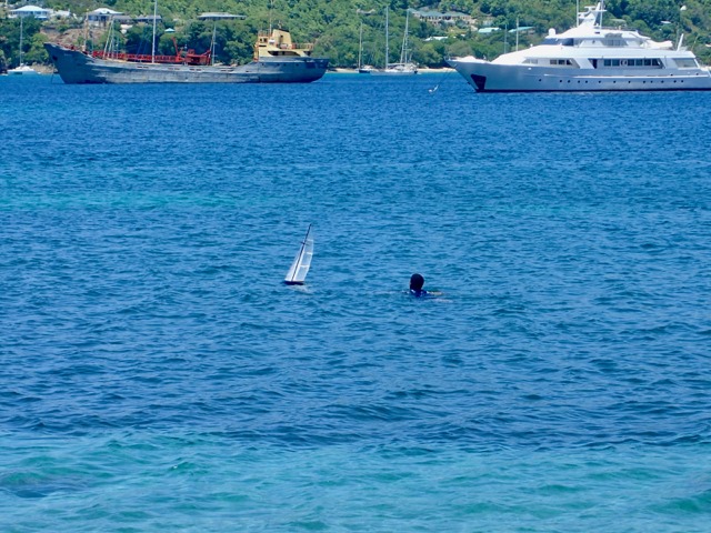 A local boy was skillfully sailing his model boat and swimming after it!