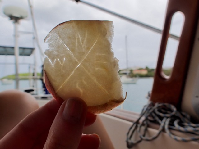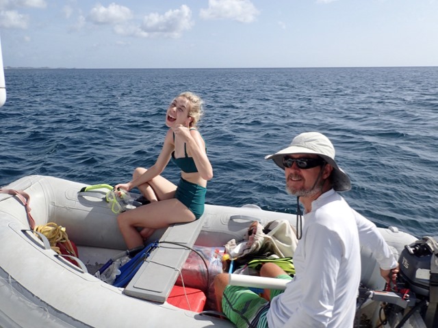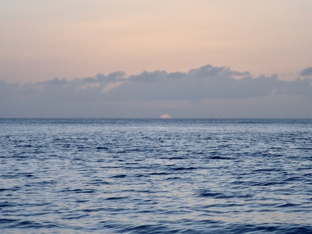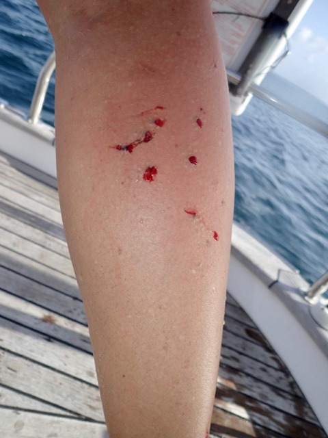 I enjoyed the beautiful sunset while I was soaking my leg in vinegar, trying to dissolve the bits of black spines that were left in my leg after Claire and I pulled them out.  Before that, I followed the advice of the captain of a snorkeling-tour-catamaran whom we saw in the vicinity of my misadventure and dinghied over to to see if he could tell us what to do.  First of all, he told us to pull the spines out, so Claire and I did that while he watched from his boat.  When we got back to our boat, we did the next thing he said to do, and poured uric acid on my wounds.  Mark provided the uric acid in a cup.  The local captain didn’t word his advice exactly like I recorded it here, and I actually had to ask him to repeat it because I didn’t understand his words, “Have your husband piss on it!”, the first time he said it.  With his accent, it sounded like he said something about peace.  The second time he said it, he added some motions so I’d make no mistake.  He was very serious about it.  Sure enough, most of the advice on the internet suggested the same thing.  So we did that, washed it really well, and soaked it in vinegar (another thing the internet suggested doing).  It stung pretty bad, and was pretty painful to the touch.  The pain subsided by the next morning, but a few days later some of my glands began to hurt and swell, so I went to the doctor and got some preventative antibiotics.  I’m all good, now!
