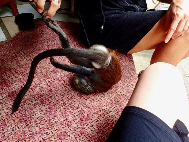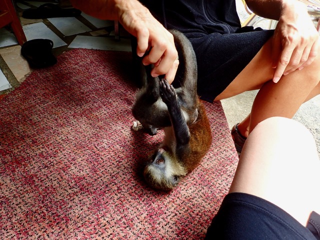 In one of the shops, Claire and I became smitten with this baby Mona Monkey.  The boy who invited us to play with him keeps him as a pet and has named him Cesar.  He said that Cesar was an orphan, and I just hope that the boy didn’t make him one.  We’ve heard that this happens.  Anyway, Cesar was sooo cute, and seemed happy.  It was like playing with a cross between a puppy and baby human!