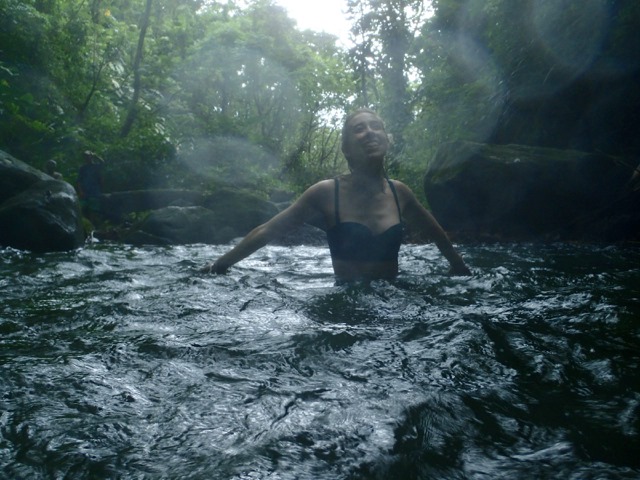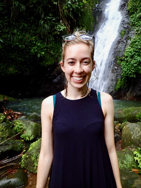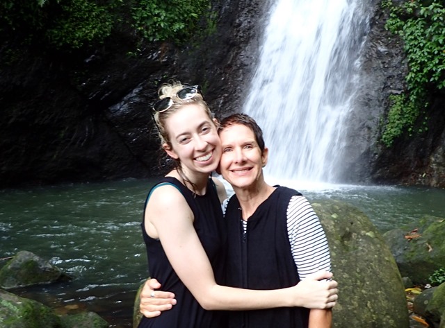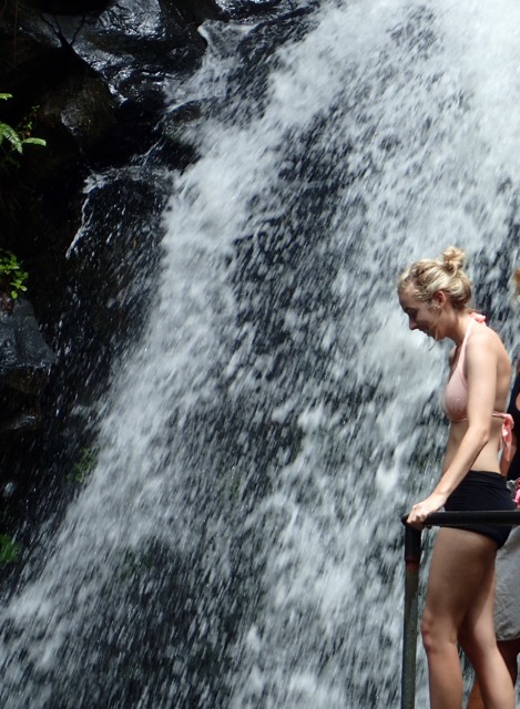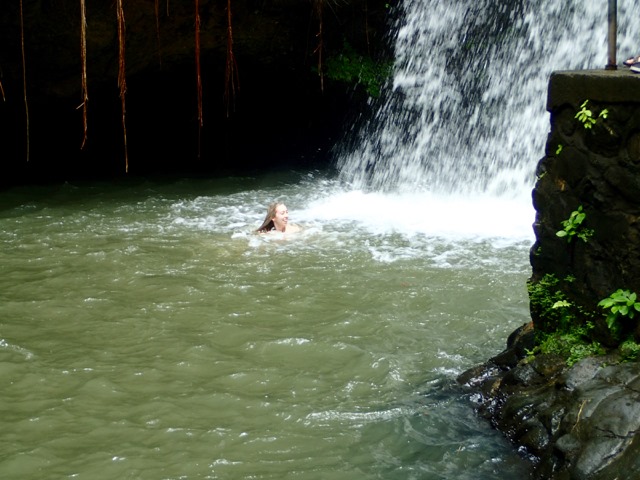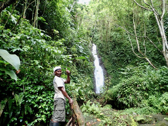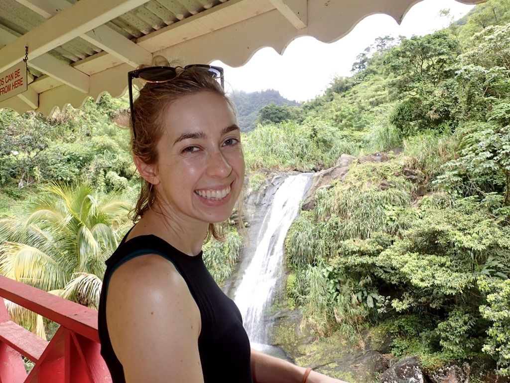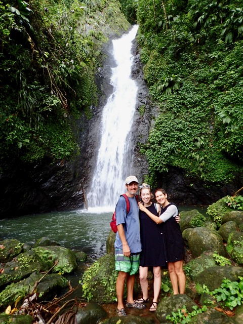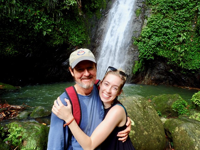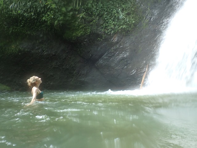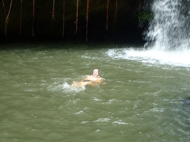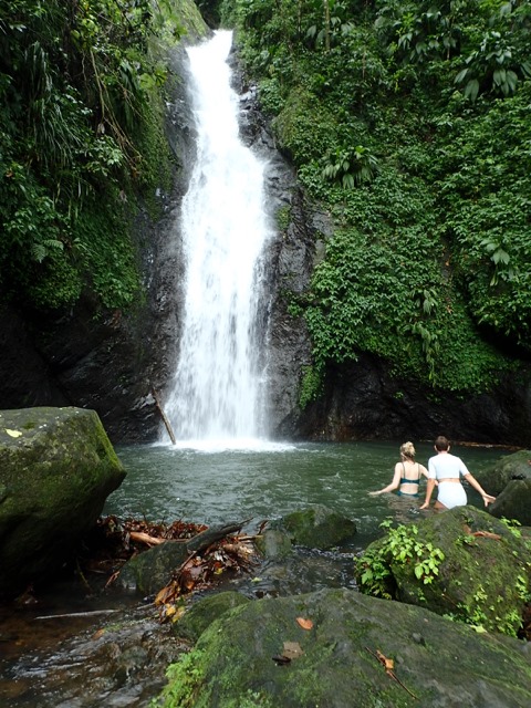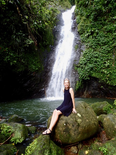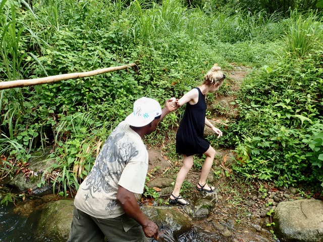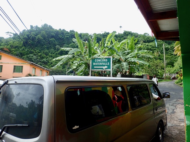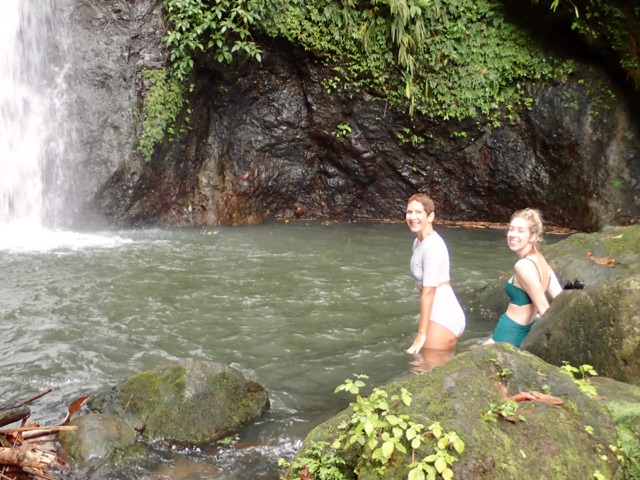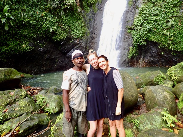 The next day was also punctuated with rain showers, but hiking up to a waterfall is a perfect activity to do on such a day!  We took a public bus to the bus stop at the Concord Falls sign and walked along the road the 2 more miles up to the first set of waterfalls.  Claire was already expressing her appreciation for Grenada’s beauty on the bus ride, exclaiming to us that this was the first time she’d ever been in a rain forest and that this would be the first waterfall she would see, but…
