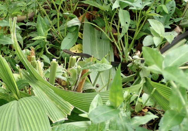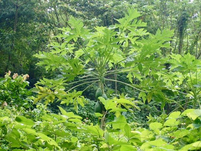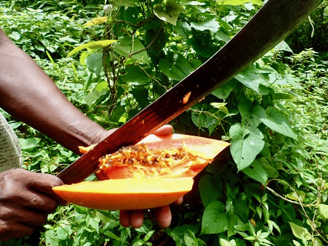 which we enjoyed!  Elvis set a couple more Papayas and the Dasheen aside on the ground to be picked up on the way back.