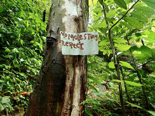 One question that he couldn’t answer for us was the meaning of this sign—No Mole Sting Respect.  He told us that he’s never been able to figure it out.  Later, when Claire and I were looking at the photos, it hit her—No Molesting, Respect!  We had a good laugh!  Still, I don’t exactly know what to make of it!  It looks like people may have carved into the trunk, so it could be asking people to respect the tree, but who knows?